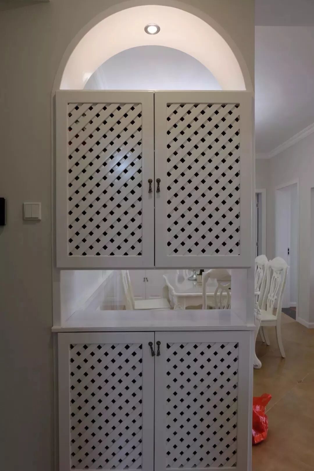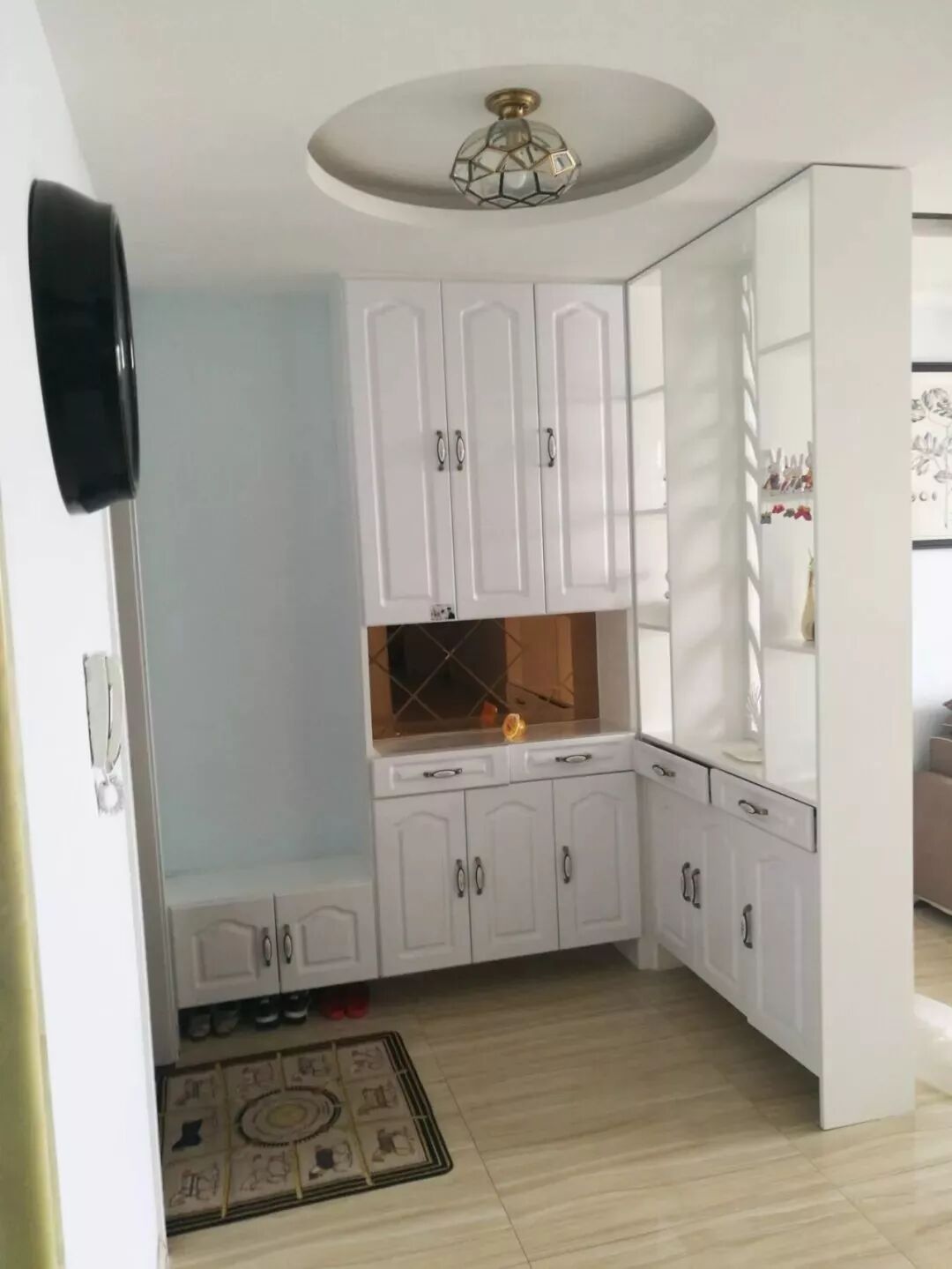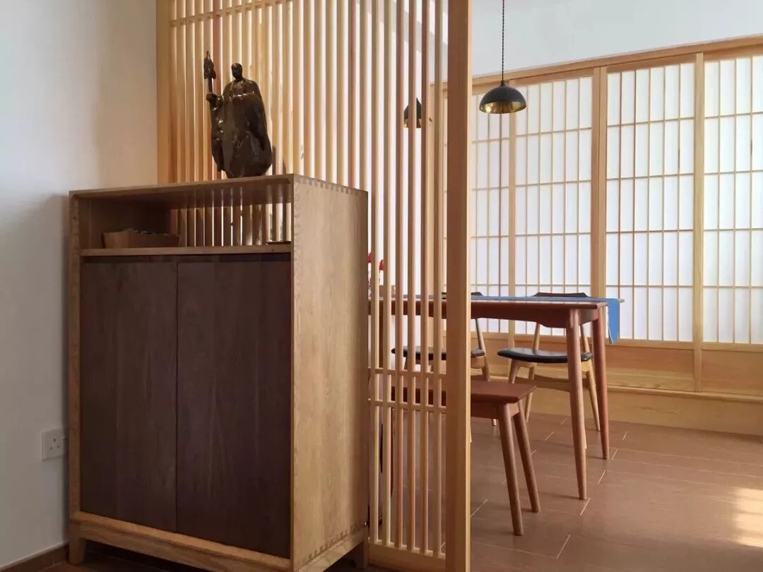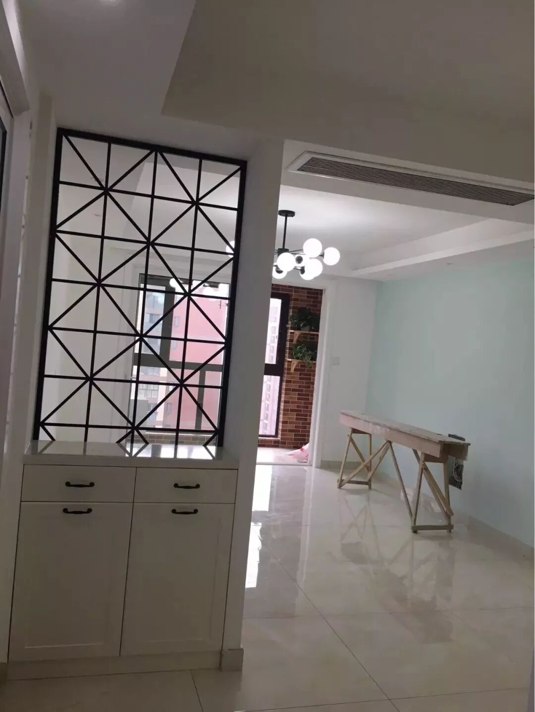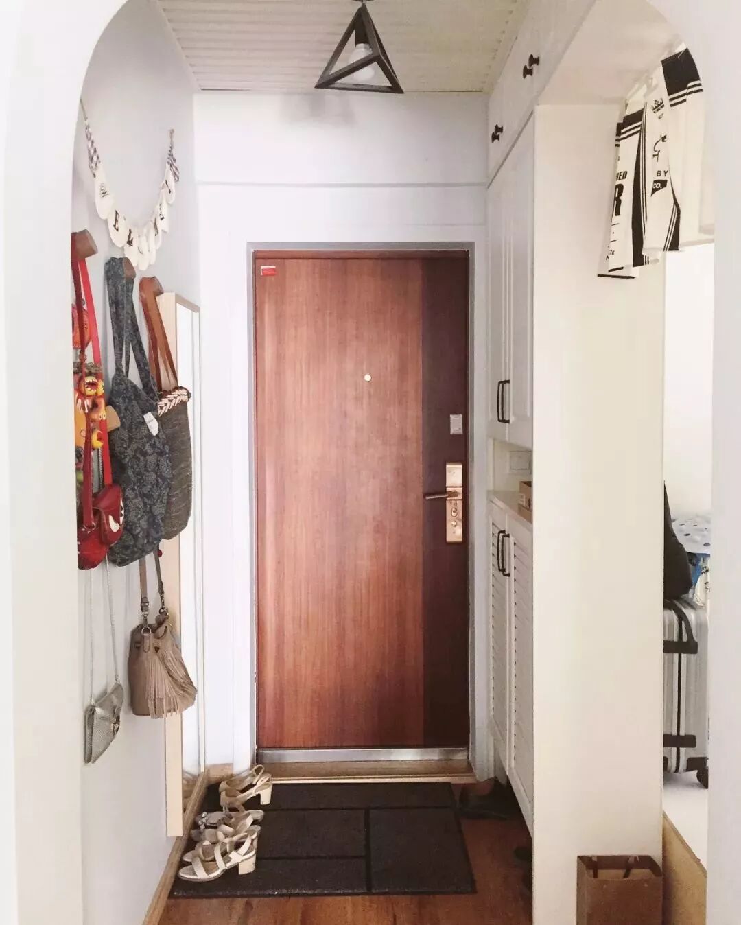 对于一进门就直对客厅或餐厅的户型,就可以在大门与客餐厅中间装个隔断+鞋柜组合的设计,增加空间的私密性,同时又增加了空间的收纳功能。