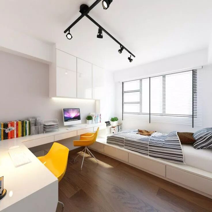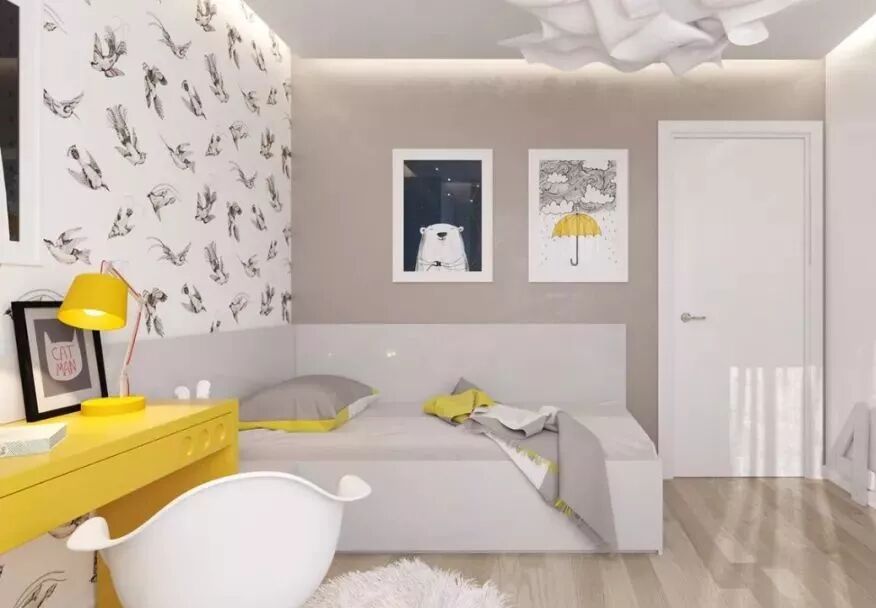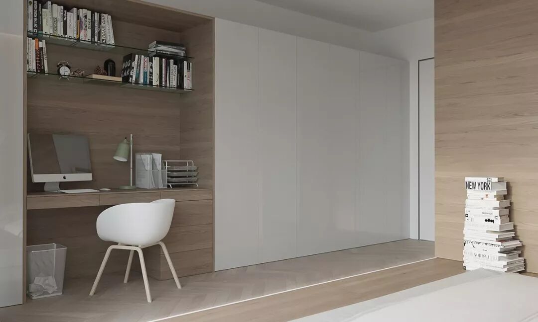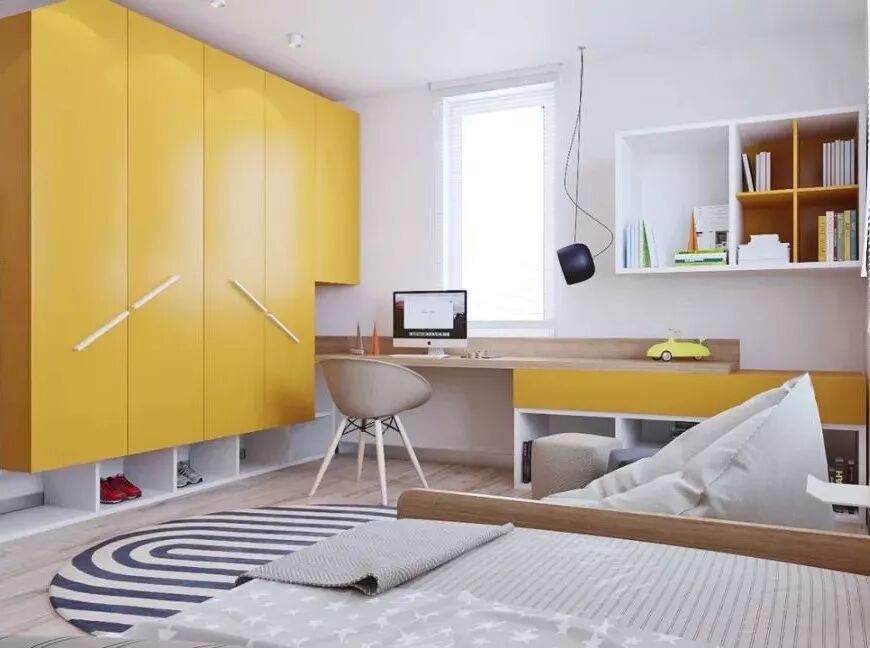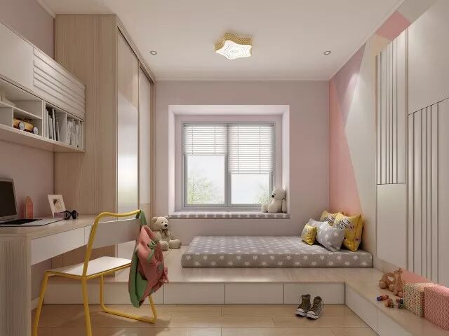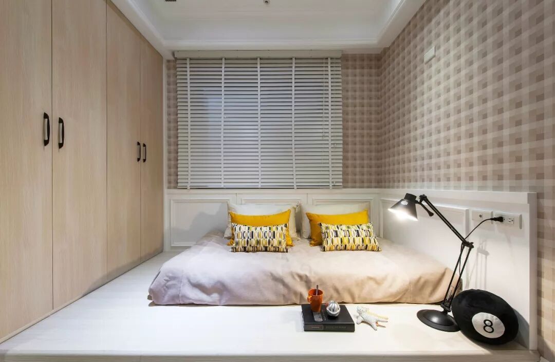 地台床与书桌、衣柜结合设计,平时既可以当书房用,家里来亲戚朋友还可以当客房使用,平时小孩子也可以在这嬉笑玩闹,用处颇多。