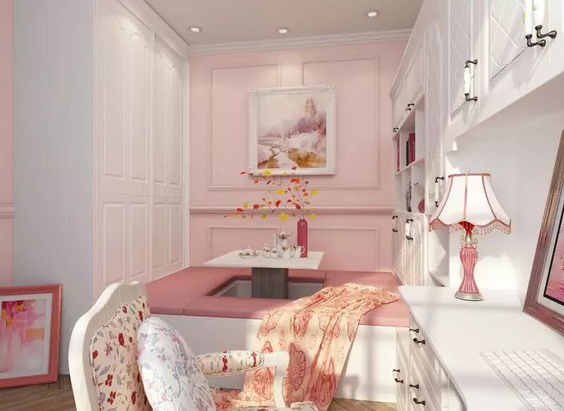 女生房设计,粉色的榻榻米,在白色的柜体与暖白色的灯光映衬下,显得格外梦幻。