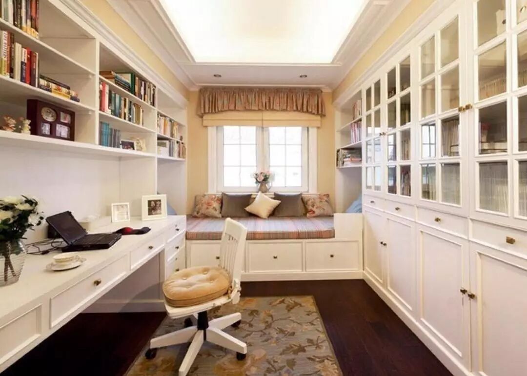 设计一个窗边榻榻米,给书房提供一个温暖舒适的休息区,采用碎花布艺靠枕,气氛一下子就变得柔和起来。