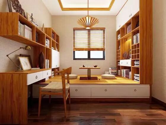 该款榻榻米空间较大,融合工作、休闲、会客等多种功能,独处时可倚窗闲读;客来时沏茶相待;筒单打点还能作为客房或家庭影院。