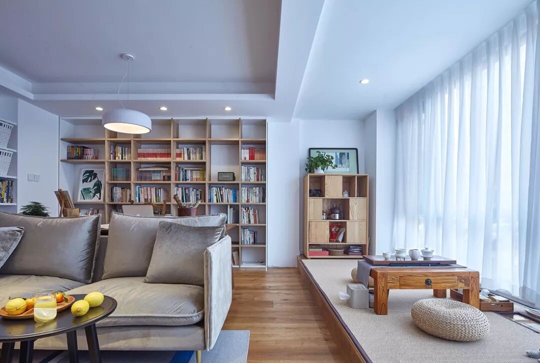 榻榻米+书桌柜+吊柜的设计,不仅可以提供强大的藏书收纳需求,还能满足学习、工作以及临时客房等需求。