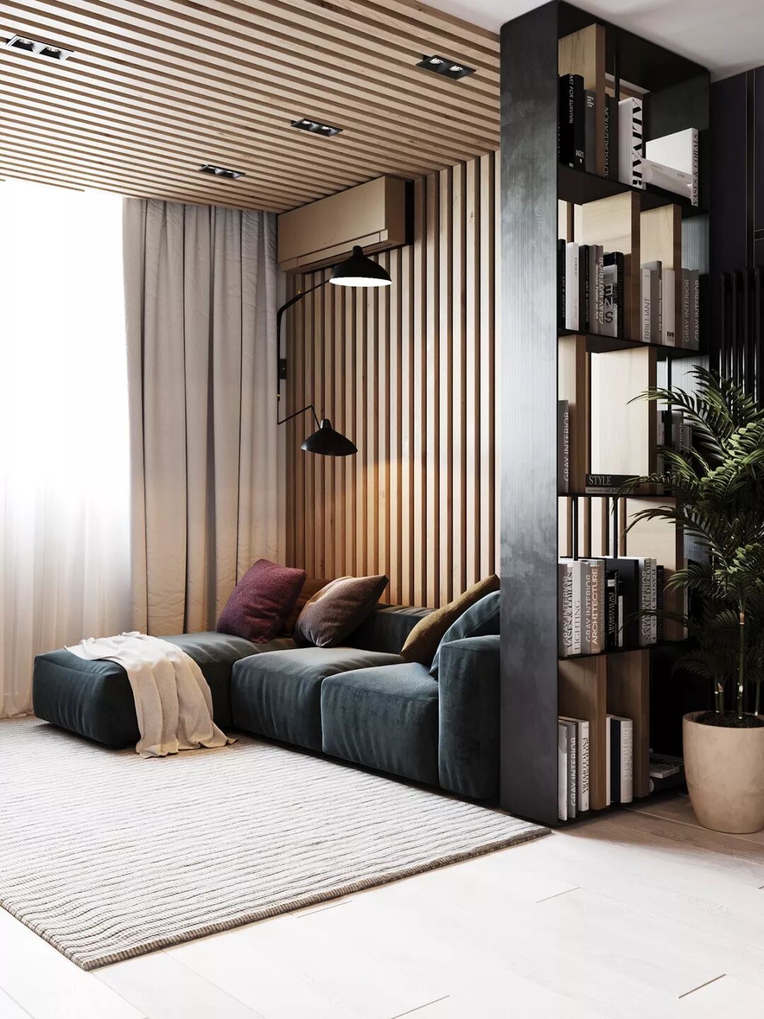 温馨自然的木格栅进行铺装,