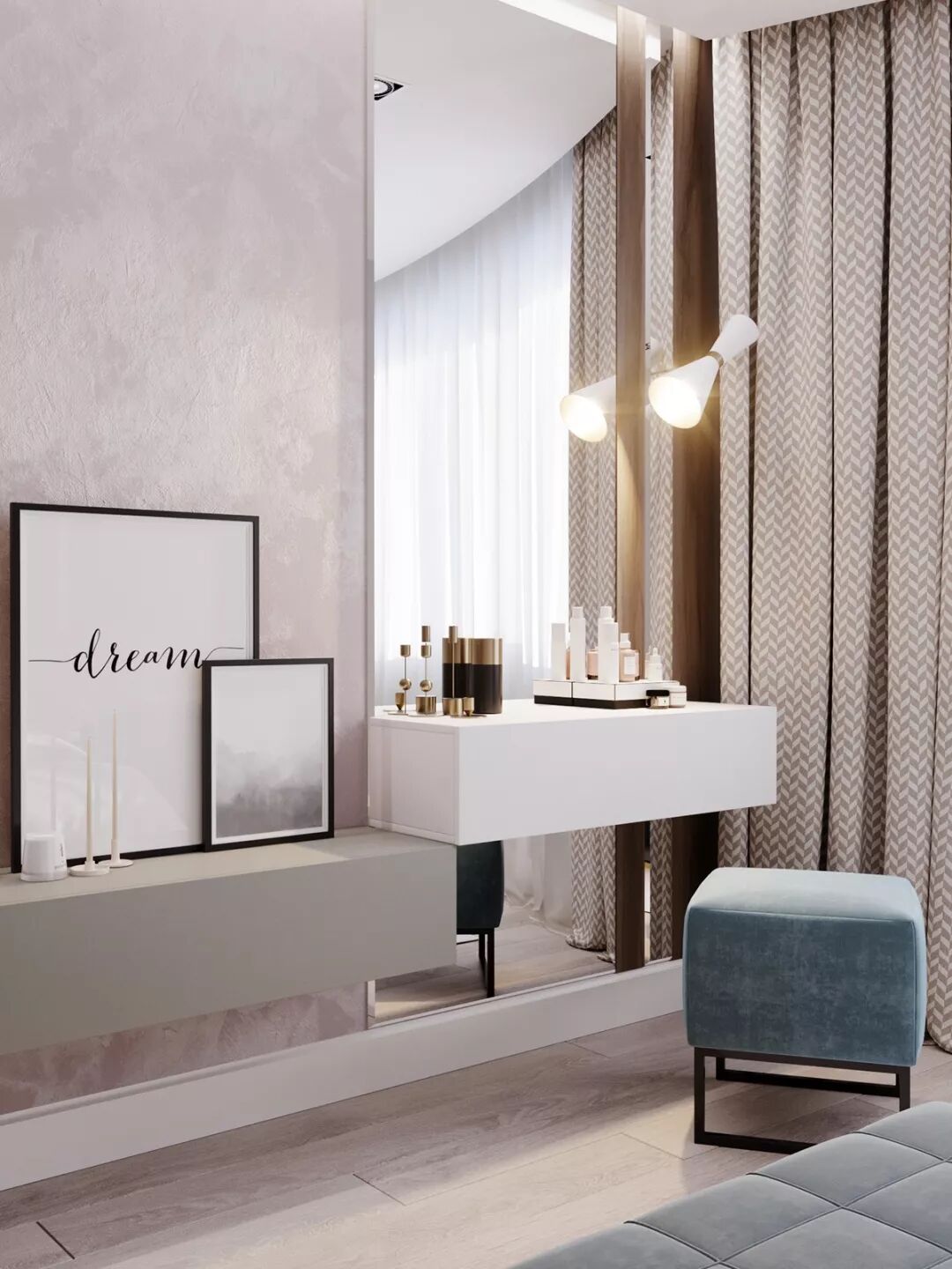增加了一个悬浮式置物柜和梳妆区,