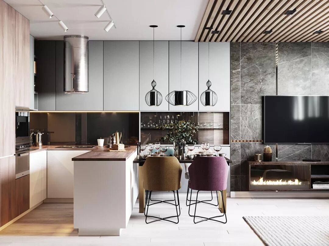 开放式厨房做了一系列的上下吊柜,