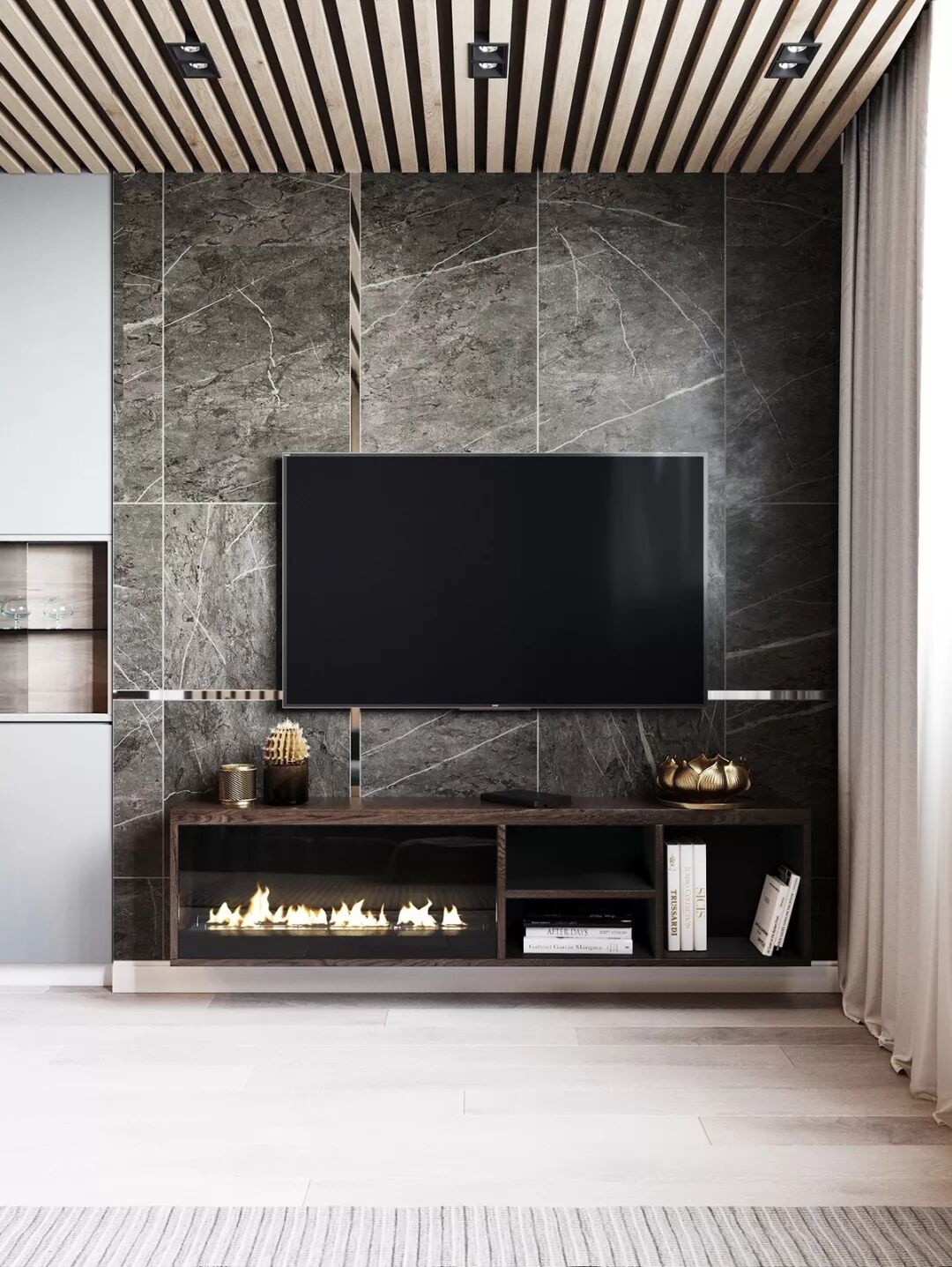 花纹大理石、木格栅、金属等元素,