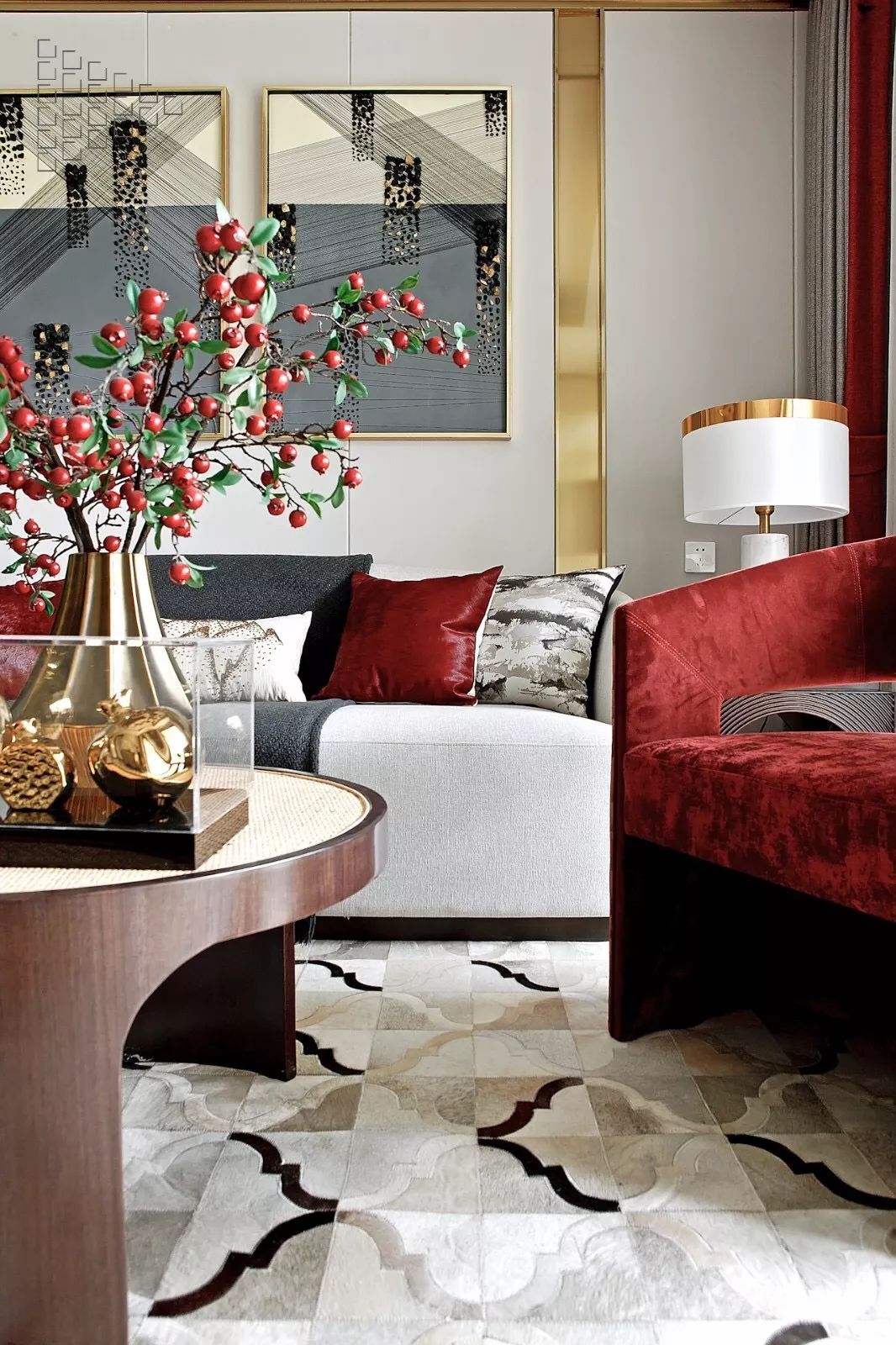 步入客厅,入眼的是一边的朱红沙发与简约大气的台灯放置一起,大气雍容,台灯的金边与墙面背景的金色装饰互相呼应,使得空间更为协调大观,选用图案精致细腻、气韵生动的装饰品,恰到好处的流露出江南的秀美,抬头可看到别致的吊灯,为宽敞明亮的空间带来了独特的美感。