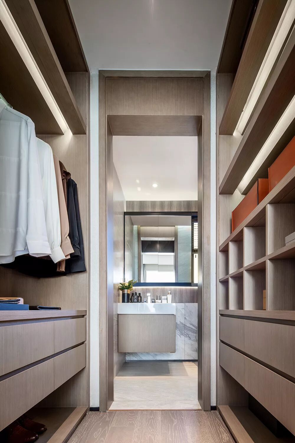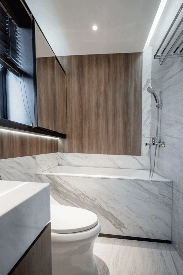 卫生间雪花白大理石和灰白瓷砖决定了空间主要调性,浴缸一侧辅以木饰面元素,在洁净画面中抢眼又独特。