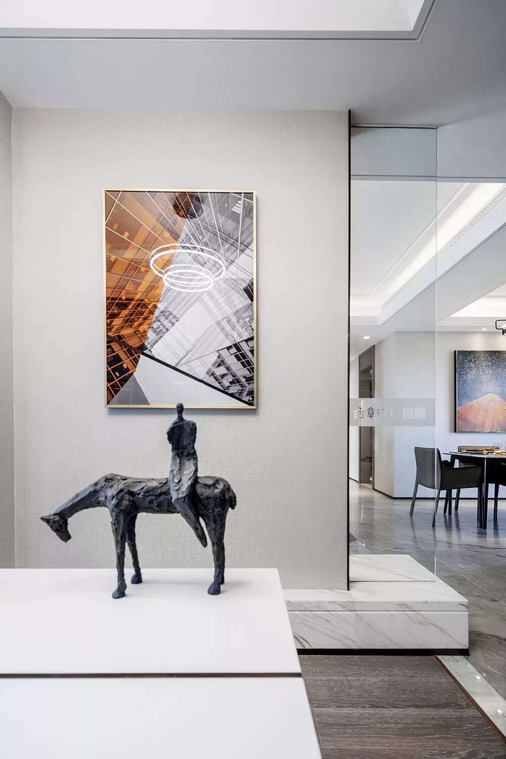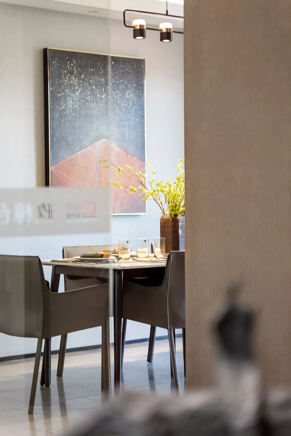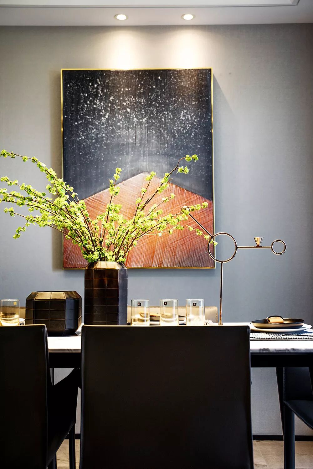 半开放式的厨房与餐厅相对,遮挡住油烟也增进了家庭的交流。餐厅的意韵跟随大空间,几何挂画也如影随形。