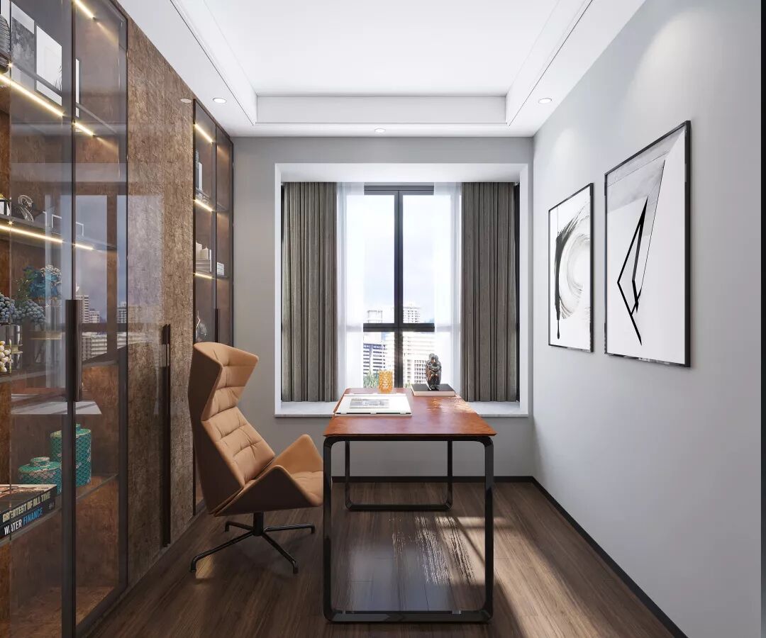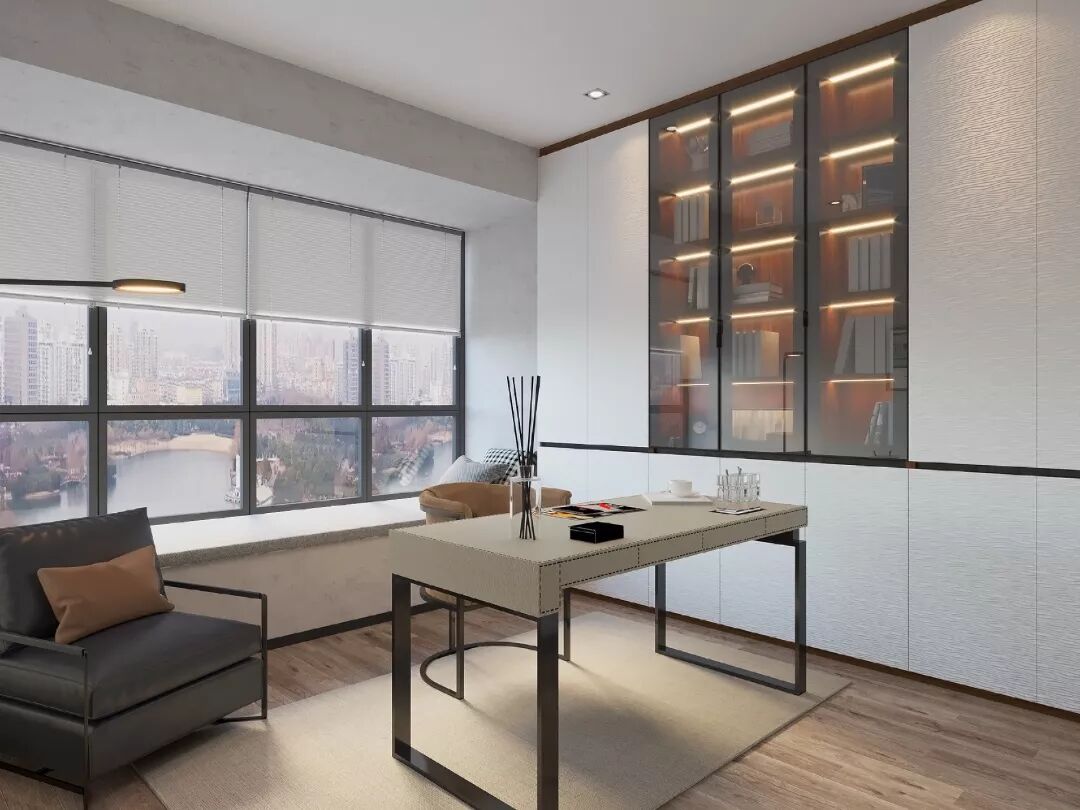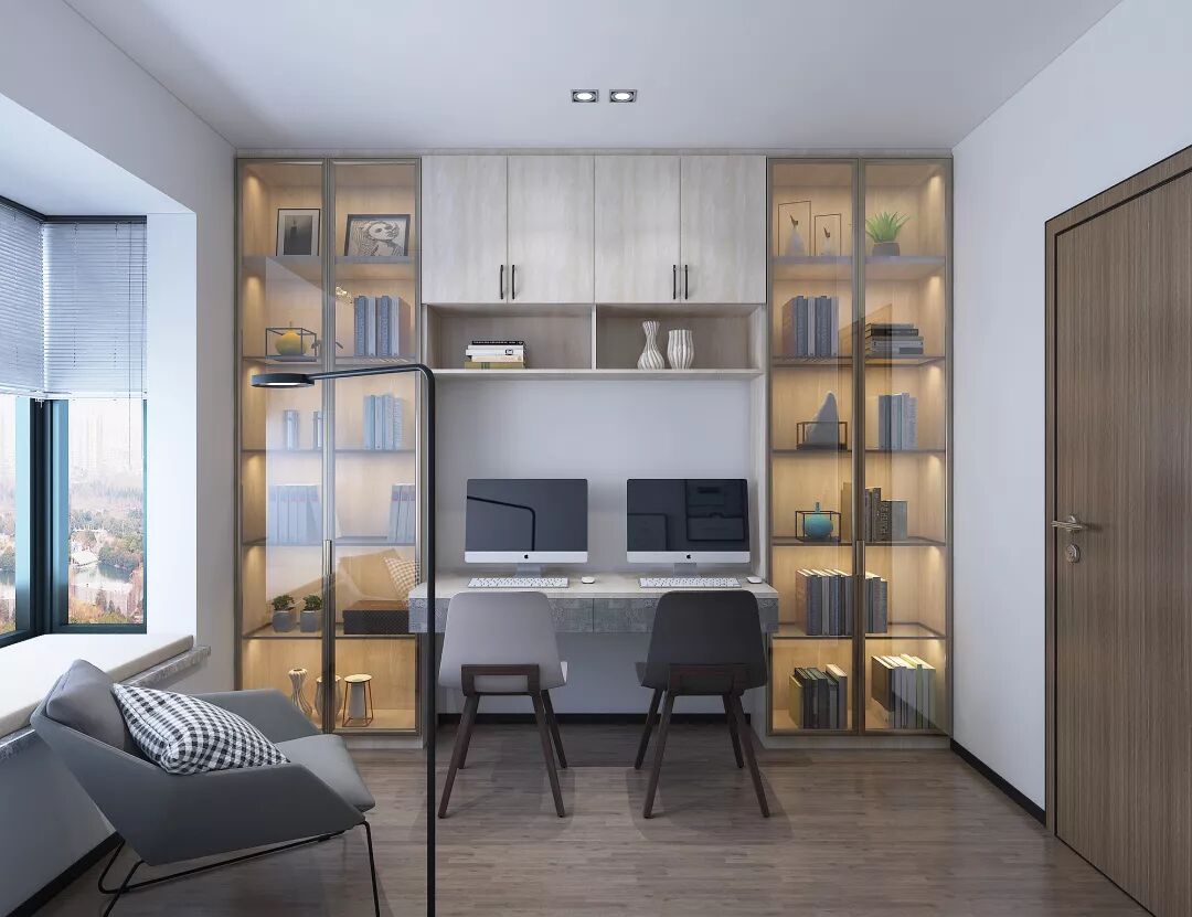 空间不够充足的也能够拥有一片大书柜,贴合空间来设计,这个书房非常巧妙地将书柜和书桌结合在一起,两边透明玻璃存放书籍,非常便利,氛围也非常nice。