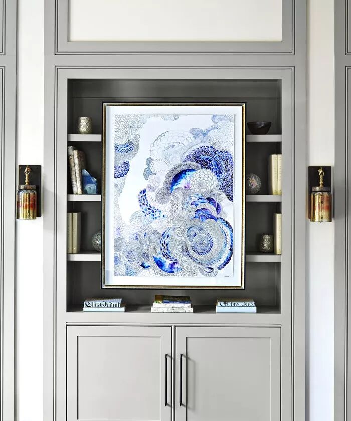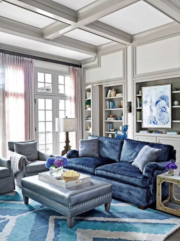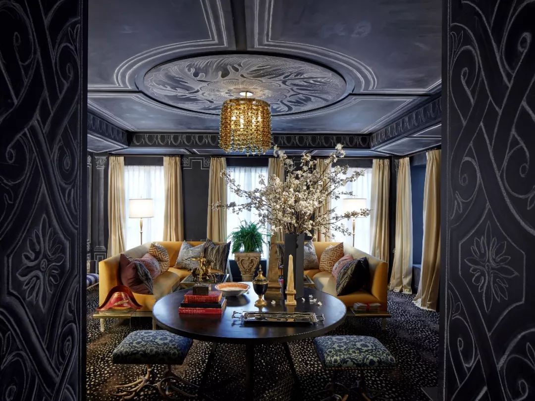 在色彩幽深的空间中,古金色往往能大放异彩,就像黑夜中的星星一样,在夜空独树一帜。在这间客厅中,深牛仔蓝的哑光漆面为奠定了整个空间的基调。白色的笔画勾勒出一个内敛的宫殿轮廓,就像一首无声的咏叹。纳瓦霍黄色的窗帘似乎是给阳光的欢迎仪式,两个古金色的皮质沙发占据着空间的中心位置,成为空间的光源,上面摆放着各式的印花抱枕。一个庞贝红的单人椅仿佛是异域的奇观。