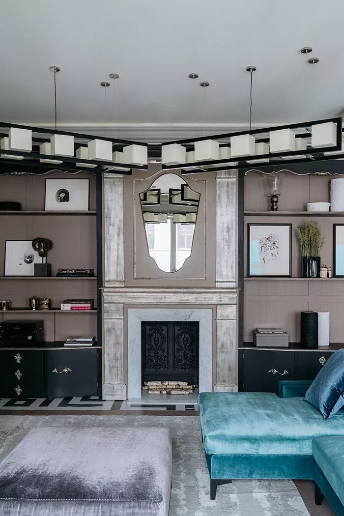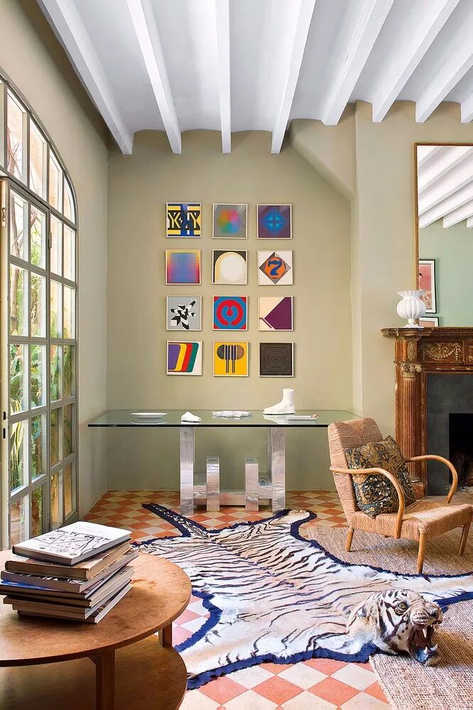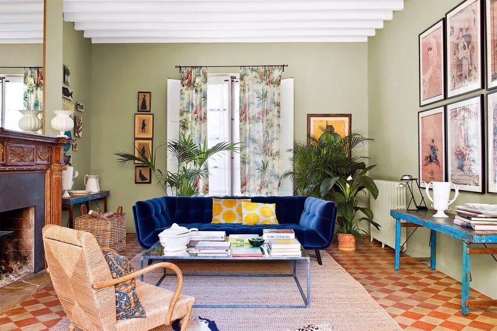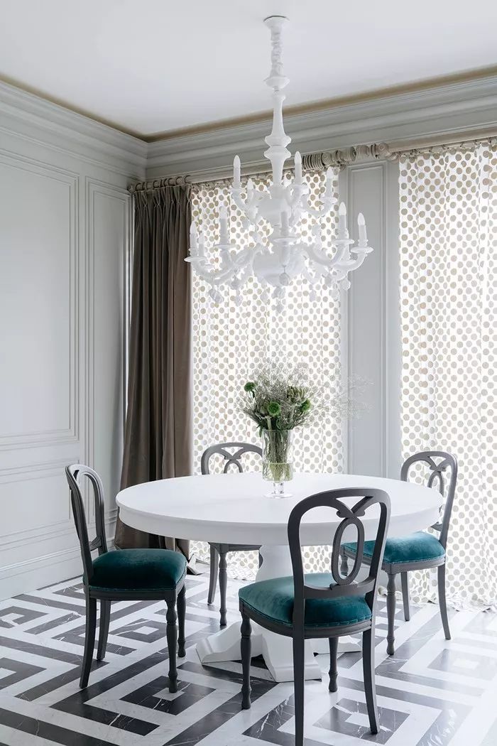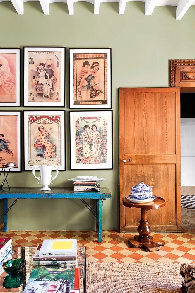 灰绿色,如诗的背景,如画的韵律。与亮白色的搭配,清爽干净,哑光的色彩回荡着时光的声响,就如小溪从山岩上潺潺坠落,青苔在水流淌过的石壁上静静发芽。在这间客厅中,19世纪的壁炉和地板被保留下来,活力橙的色彩和重复的几何图案复古而别致;米克诺斯蓝天鹅绒沙发增添了贵族气息。