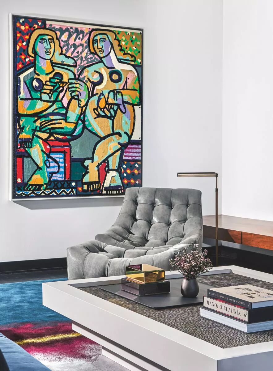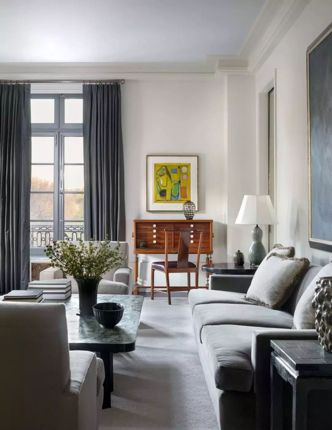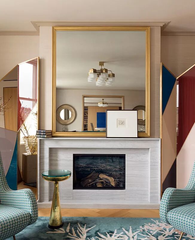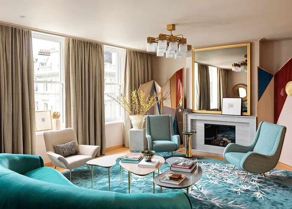 灰绿色,如诗的背景,如画的韵律。与亮白色的搭配,清爽干净,哑光的色彩回荡着时光的声响,就如小溪从山岩上潺潺坠落,青苔在水流淌过的石壁上静静发芽。在这间客厅中,19世纪的壁炉和地板被保留下来,活力橙的色彩和重复的几何图案复古而别致;米克诺斯蓝天鹅绒沙发增添了贵族气息。