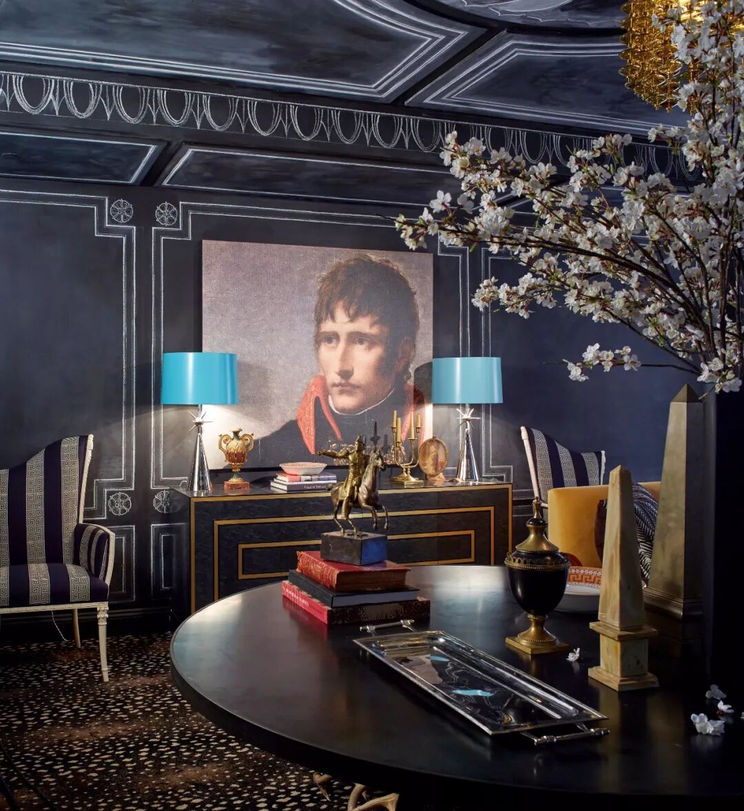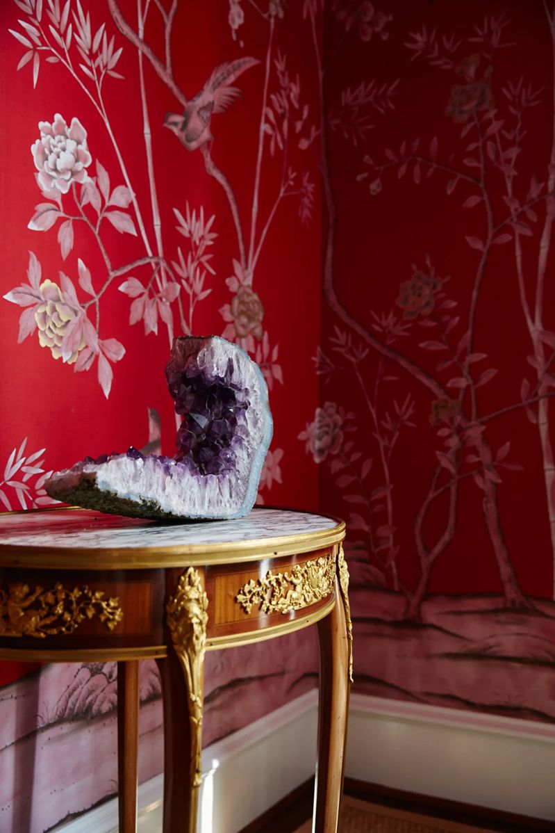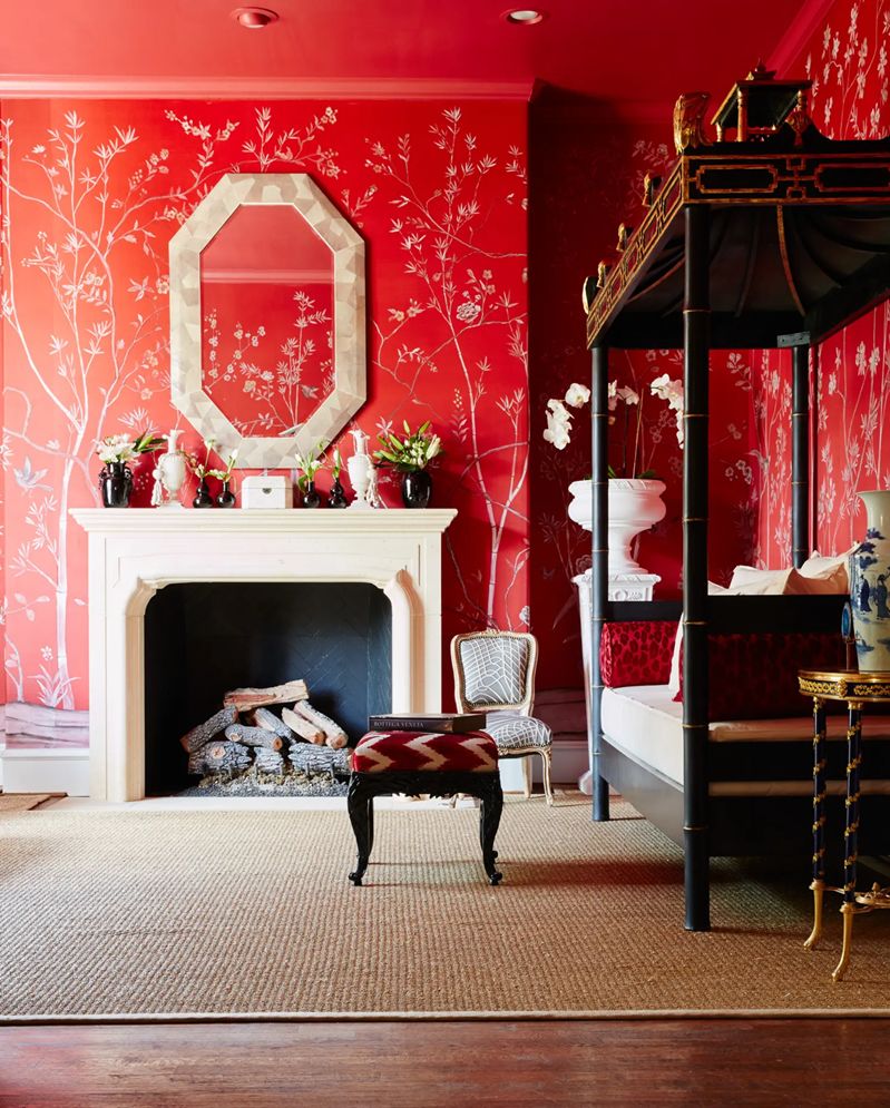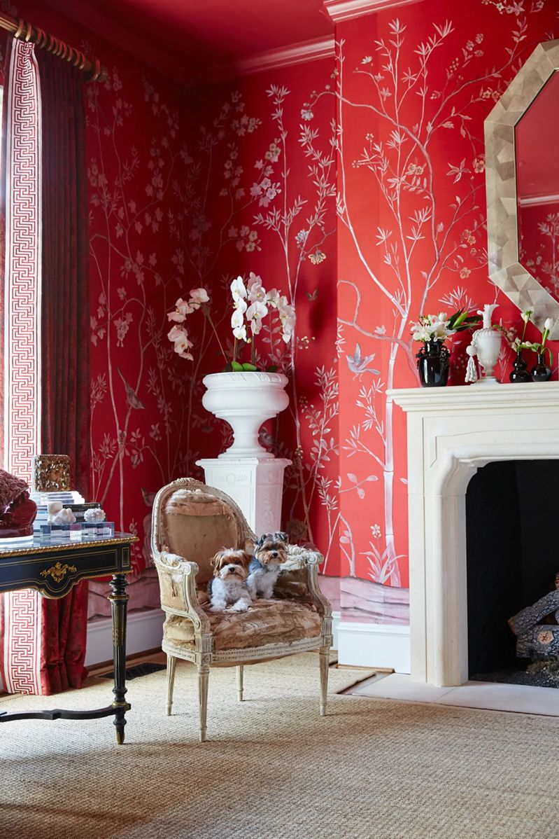 在这间客厅中,设计师利用她对图案的偏爱——也就是手绘中国墙纸的形式——以及房主自己对传统(通常是18世纪的法国)装饰的诀窍,创造出优雅而清新的室内装饰。弯曲而精致的法式古董家具带来宫廷氛围,定制的装饰品激发了室内的活力,de Gournay的手绘墙纸在火红的阴影中闪耀,一直燃烧到天花板上,米歇尔(Michelle)设计的宝塔床靠墙摆放,提供了一个诱人的休息角落。