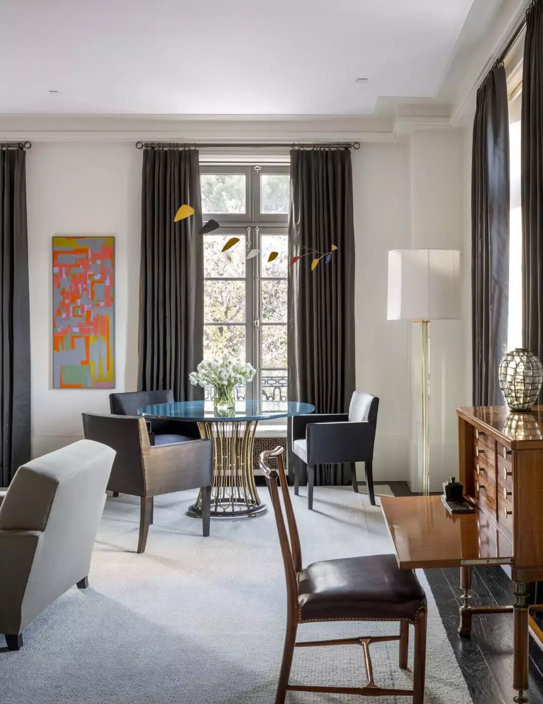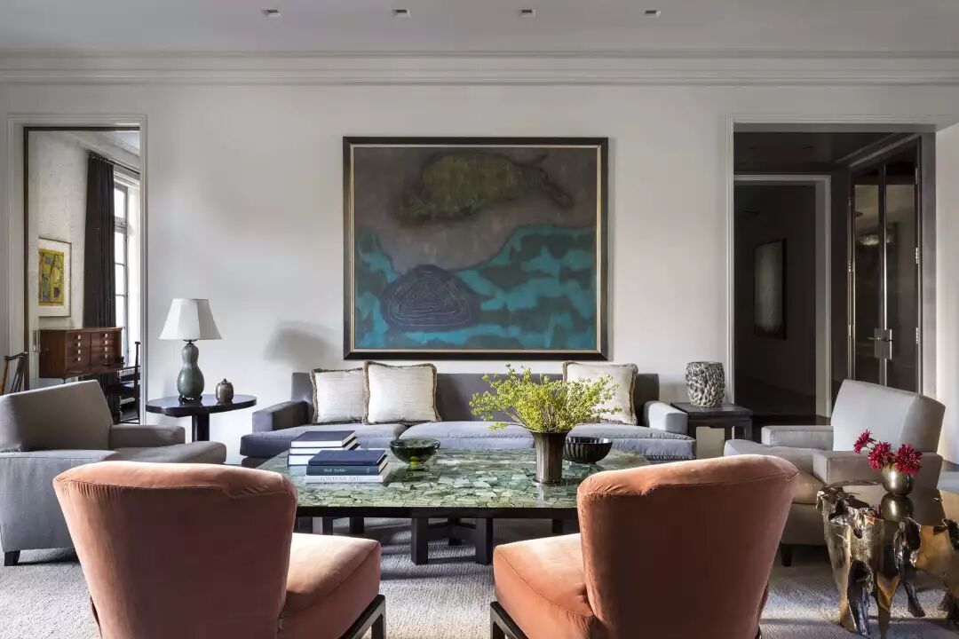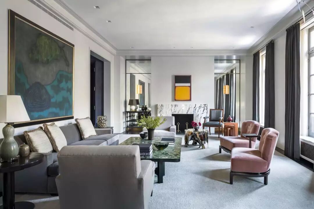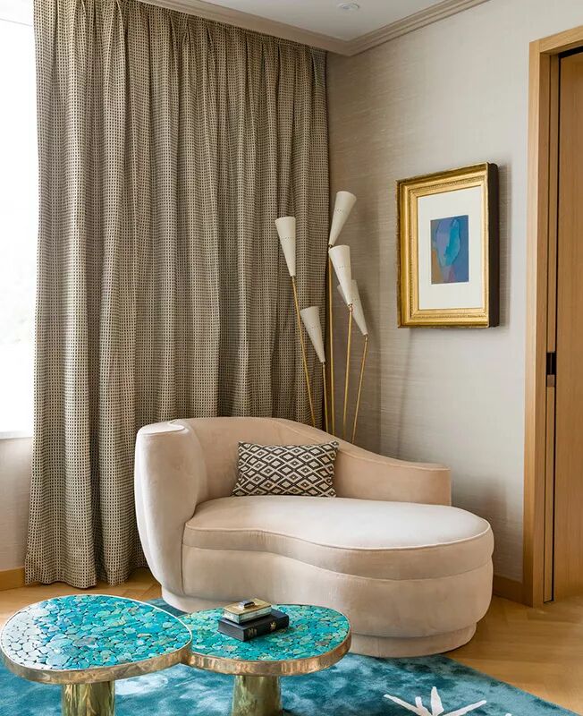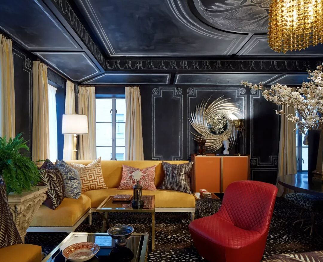 在这间客厅中,设计师利用她对图案的偏爱——也就是手绘中国墙纸的形式——以及房主自己对传统(通常是18世纪的法国)装饰的诀窍,创造出优雅而清新的室内装饰。弯曲而精致的法式古董家具带来宫廷氛围,定制的装饰品激发了室内的活力,de Gournay的手绘墙纸在火红的阴影中闪耀,一直燃烧到天花板上,米歇尔(Michelle)设计的宝塔床靠墙摆放,提供了一个诱人的休息角落。
