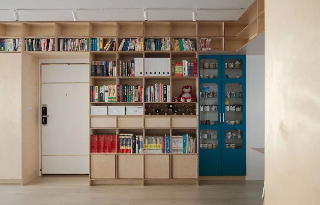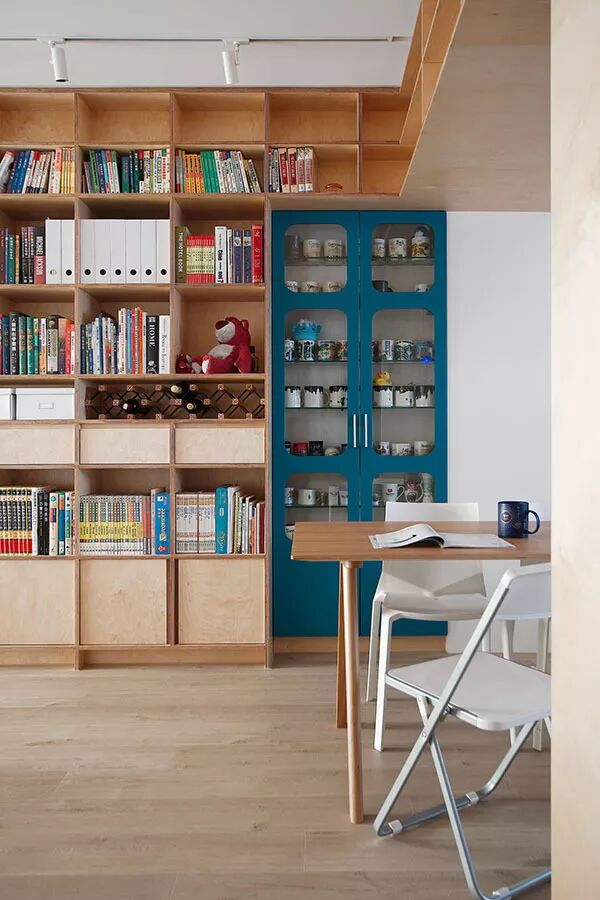 电视柜、书架、收纳柜合为一体,屋主的书、酒还有收集的马克杯都摆进了这个收纳柜,配合白色墙面,大面积的浅色提升了客厅的亮度,蓝色的柜门又给整个空间增加一丝俏皮感。