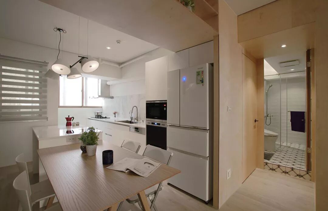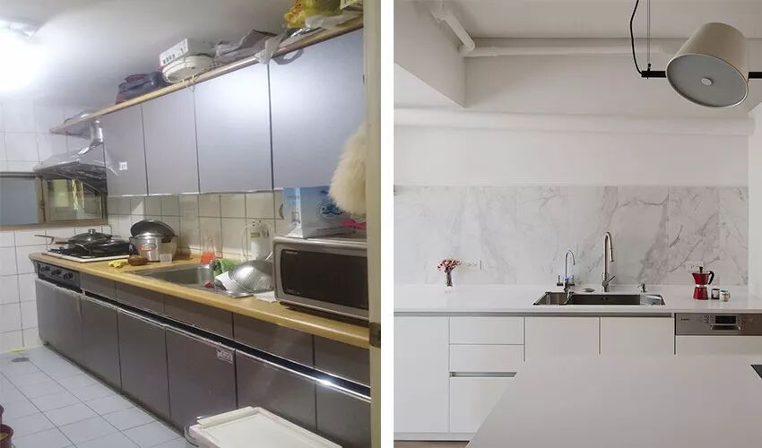 原先的厨房设计较为传统,做了上下厨柜,因此显得拥挤,容易藏污纳垢,另外采光较差。