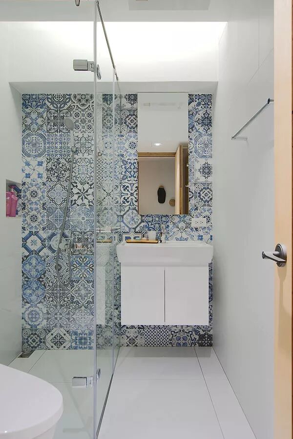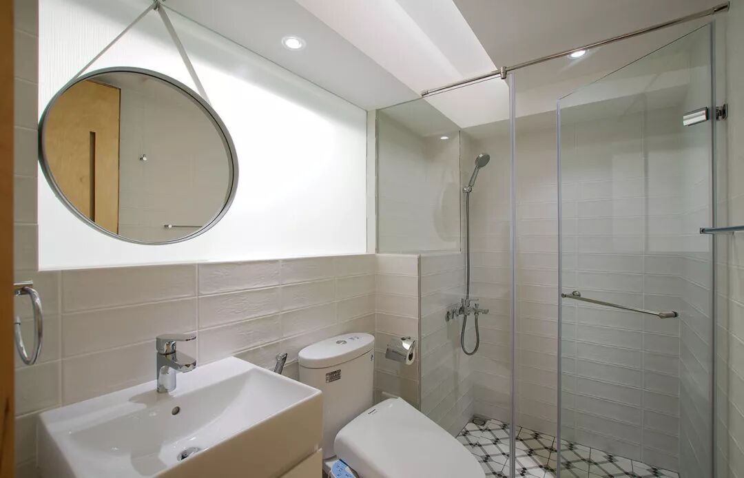 主卫和客卫风格统一又有各自的特点。同样选择了花砖装饰,一个铺墙面一个铺地面,让白色系的卫生间不至于显得单调。