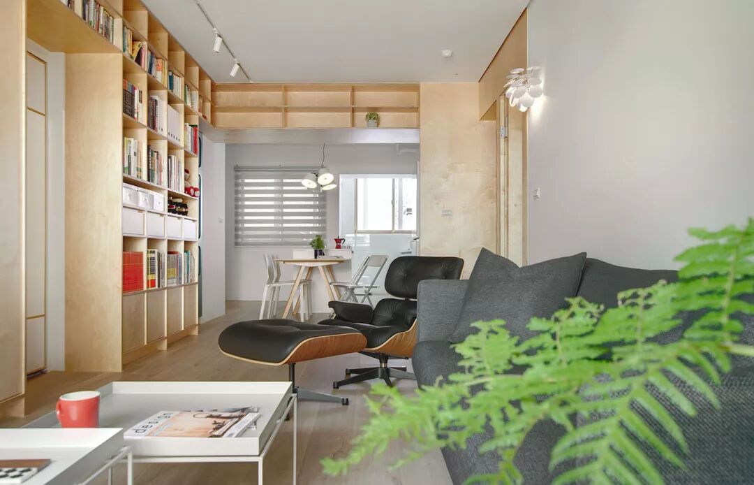考虑到屋主喜欢原木无印风,设计师设置了一整面墙的开放式收纳柜,从客厅延伸至餐厅,连横梁都利用上了。