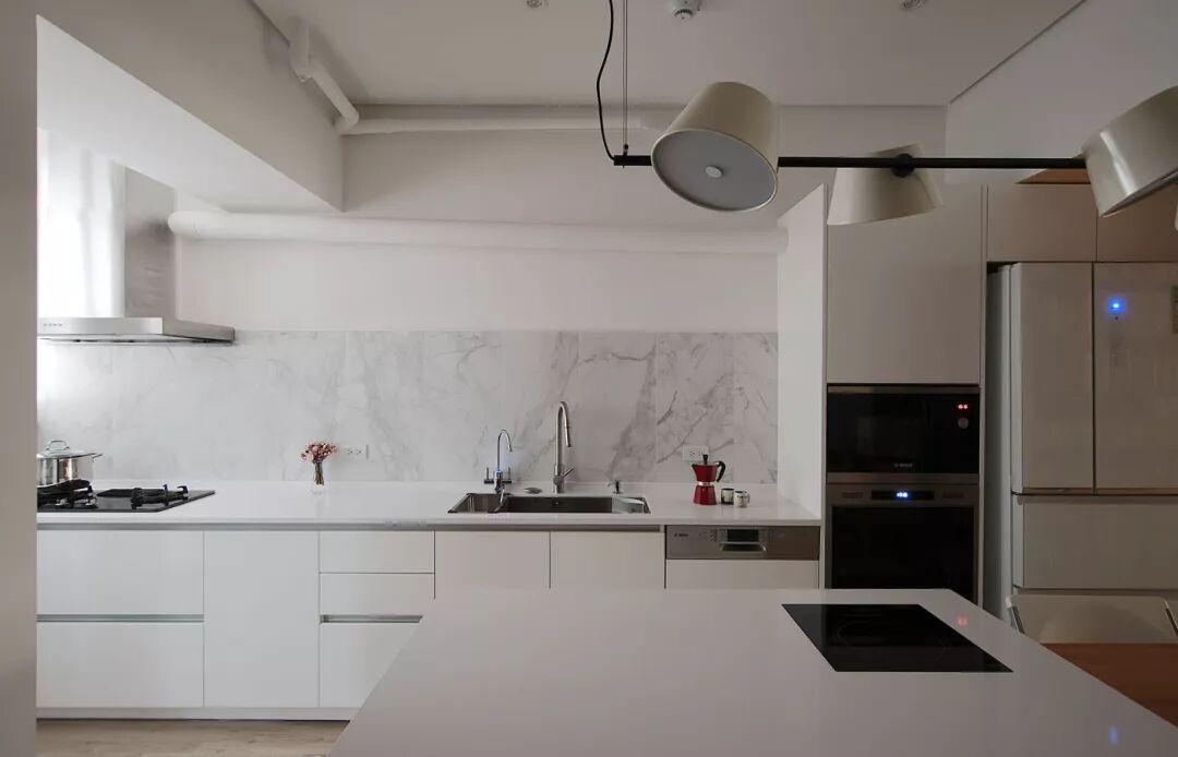 因为男主人喜欢料理,所以厨房也是此次老房翻新的改造重点之一,运用了大面积的大理石材料,搭配白色柜子,更加简约明亮,另外也方便清理油污。