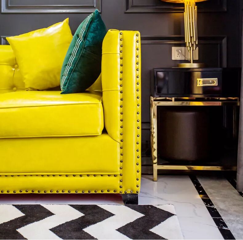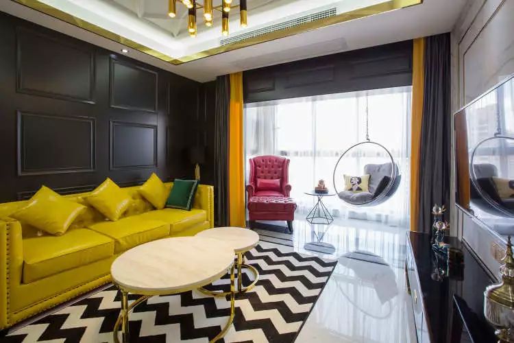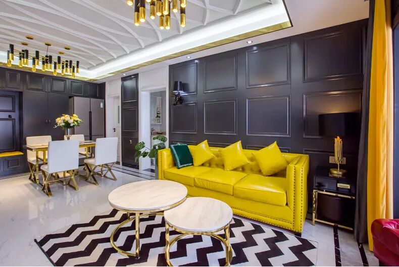 ▲黄色的皮沙发靠在深色沙发墙上,搭配两张大理石质感台面的茶几,显得时尚而又优雅活力。