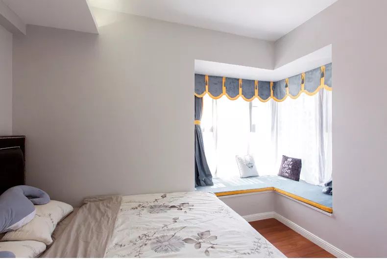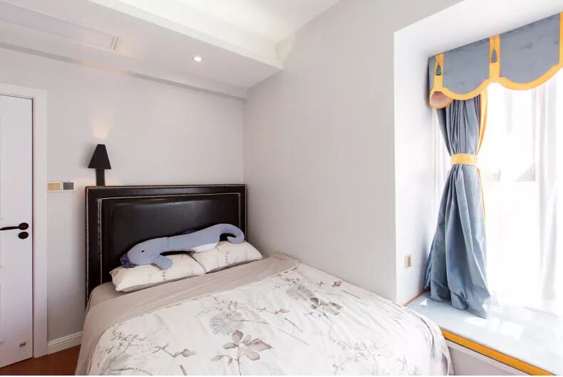 ▲儿童房空间的色调相对淡雅,床尾处是一个L形的飘窗,垫上蓝色布艺坐垫与窗帘,整体显得优雅而又浪漫情趣。