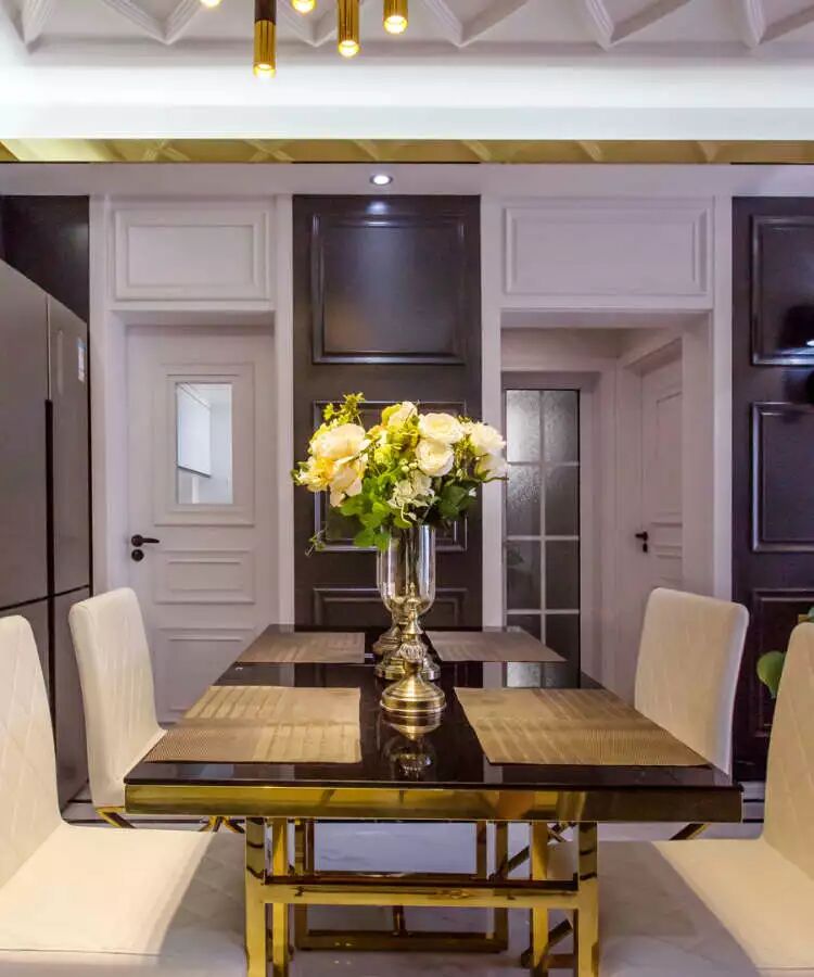 ▲餐桌上摆着铜质底座的鲜花花瓶,为空间注入了一丝自然优雅的气息。