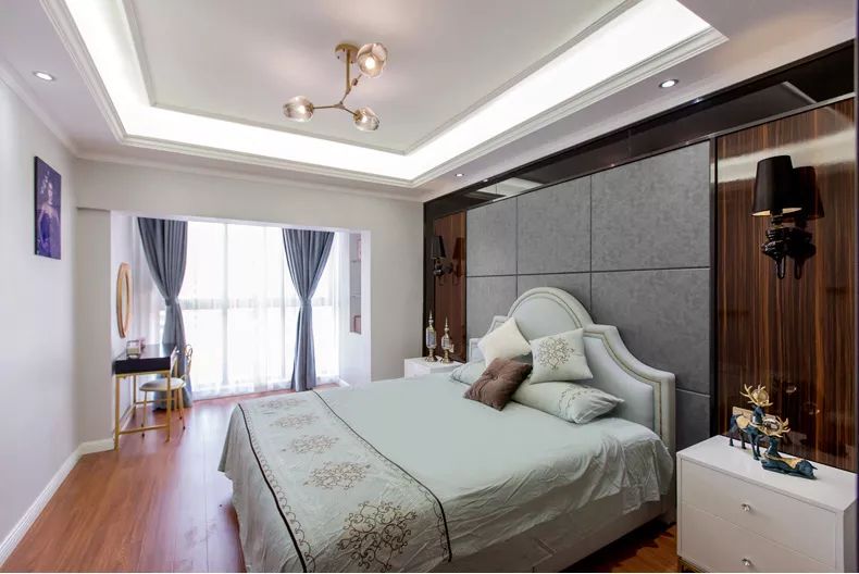 ▲卧室床头墙以木色+硬包造型,两侧木质基础还挂上壁灯,搭配上软垫靠背的床铺,宽敞舒适的卧室显得格外的沉稳舒适。