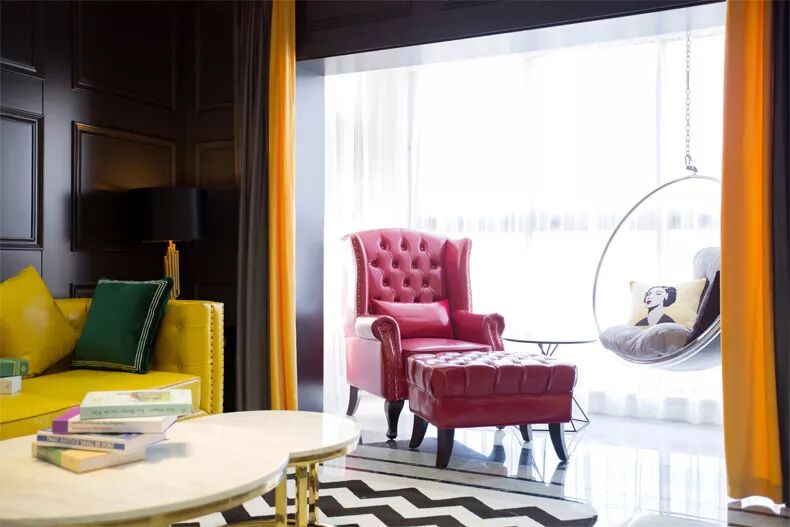▲阳台打通后以棕咖色+黄色窗帘隔开,阳台里摆上一套玫红色皮沙发,还有一张半球形的吊椅,为女主人营造出一个浪漫情趣的角落。