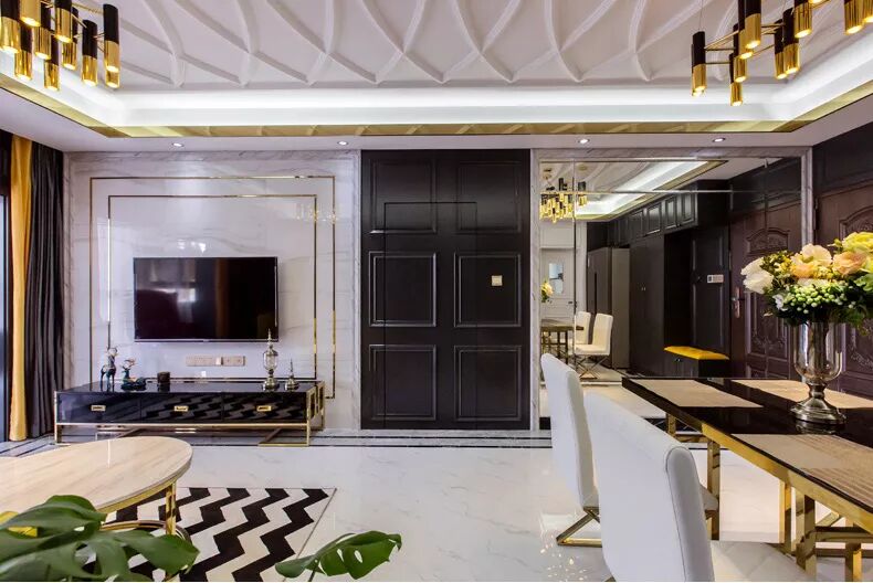▲沙发墙以深木色的护墙板,中间雅白的地面垫上黑白纹理的波浪地毯,大理石质感的电视墙配上金属边框,整个空间大胆的配色,显得庄重而又时尚。