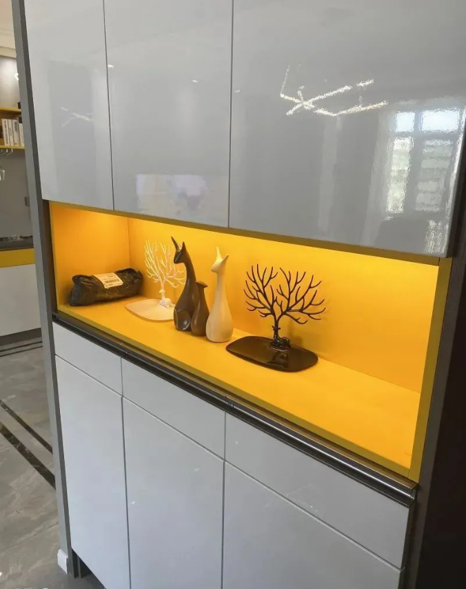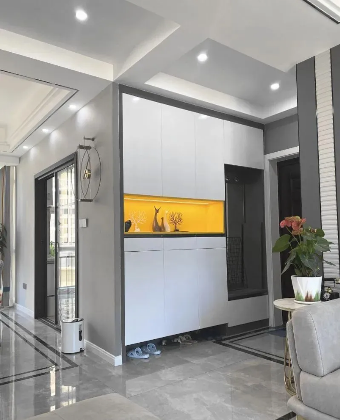 玄关柜中间一抹时尚黄点缀,打破白色的单调无趣;开放格装上层板灯,回家时放钥匙灯光亮起,增添温馨感。