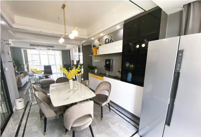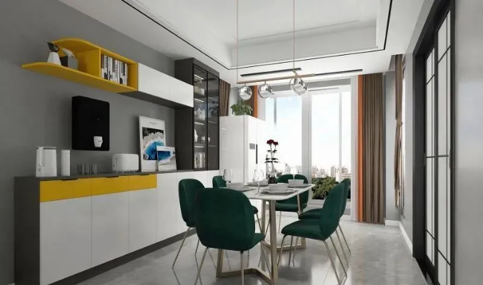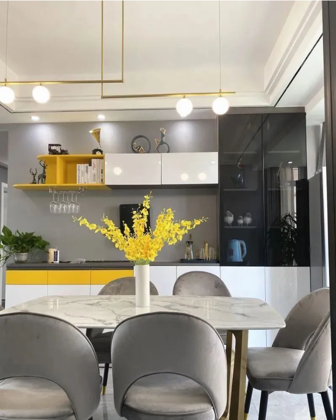 餐厅完美复刻效果图,餐边柜同玄关柜一样,以一抹时尚黄点缀,形成呼应