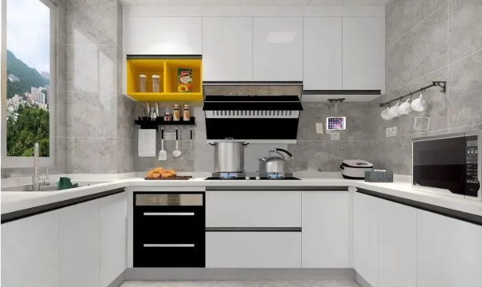 厨房面积不大,但把冰箱外置之后就有了足够的空间设计U型厨房。灰色系瓷砖+白色橱柜,浅色的运用让小厨房更显大,也更显明亮。