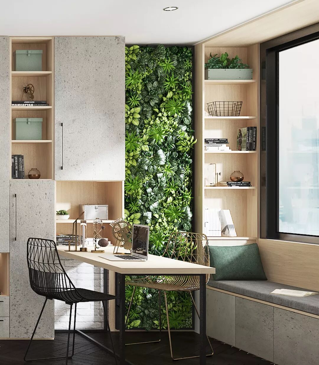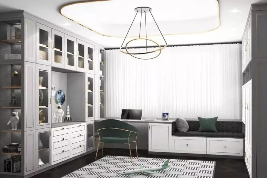 将原本飘窗的空间,定制飘窗小书房,摆上绿植,营造出一个绿意盎然的书房空间……工作或者学习累了,抬头就可以眺望到远处的风景,更加有助于眼睛的休息,保护视力。