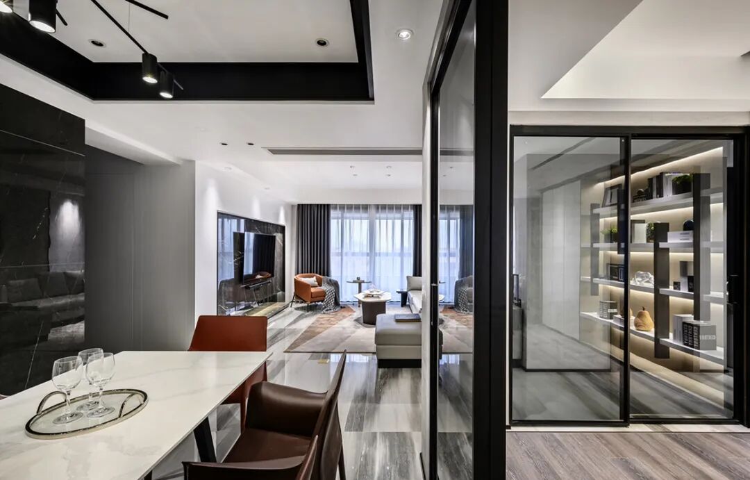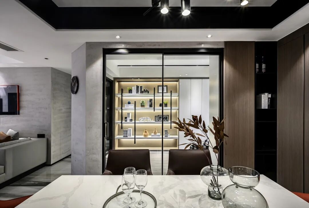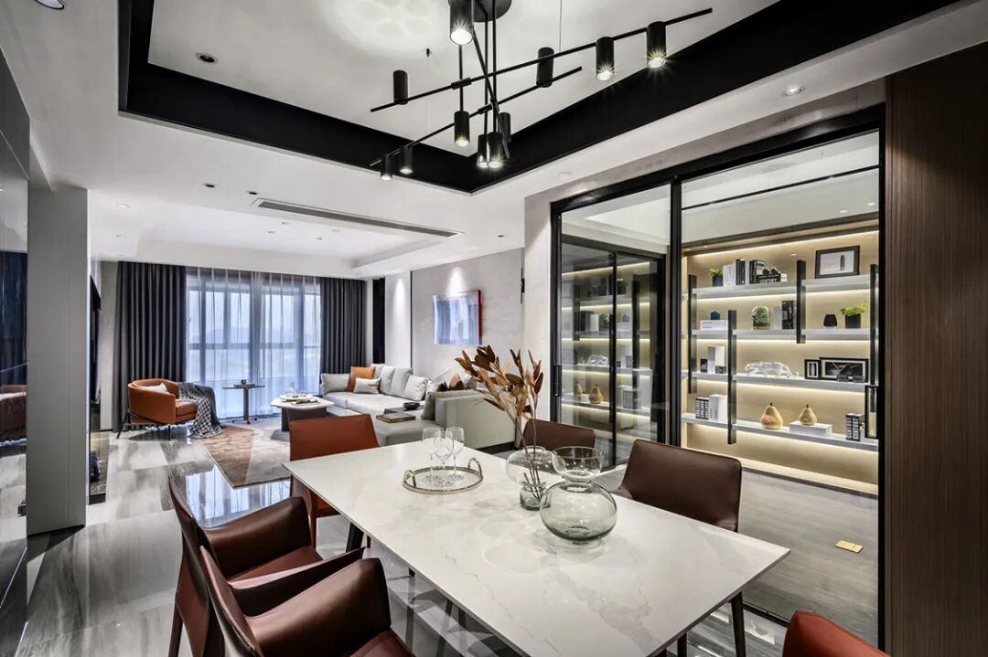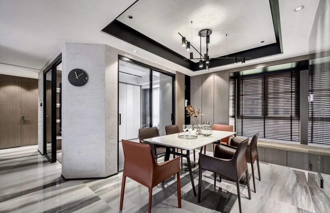 ▲餐厅现代优雅的空间基础,吊顶加入黑色的边框元素,侧边书房空间也是做了个斜角,让餐厅不会显得局促紧迫。