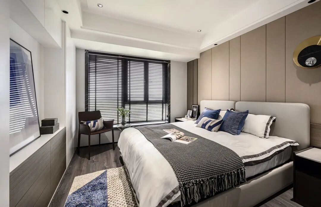▲现代舒适的卧室,床头墙以硬包板处理,摆上皮质的床铺,素雅精致的卧室空间,让睡眠体验显得轻松而又优雅从容。