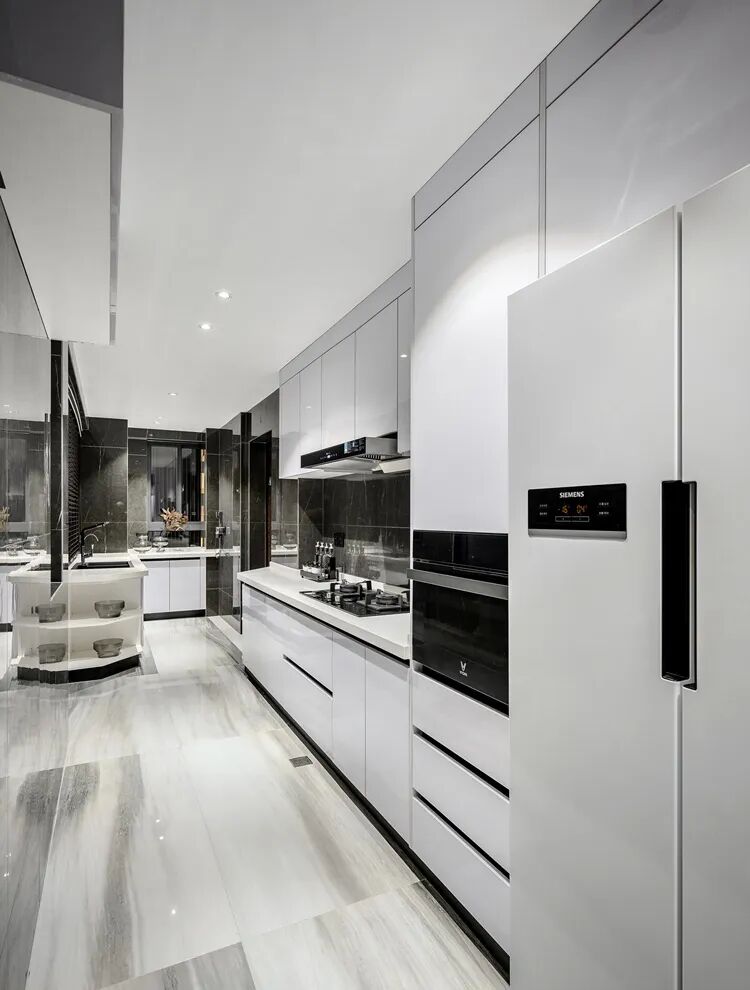 ▲厨房空间较长,脏灰色的地墙面,搭配黑白配橱柜电器组合,让做饭的空间也显得格外的现代时尚。