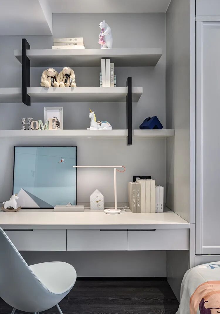 ▲儿童房的床头墙以童趣的雪山+梯子气球墙布为背景,角落加入一个入墙式的展示柜,搭配活泼舒适的床单抱枕,呈现出一种活力梦幻的浪漫视觉感。