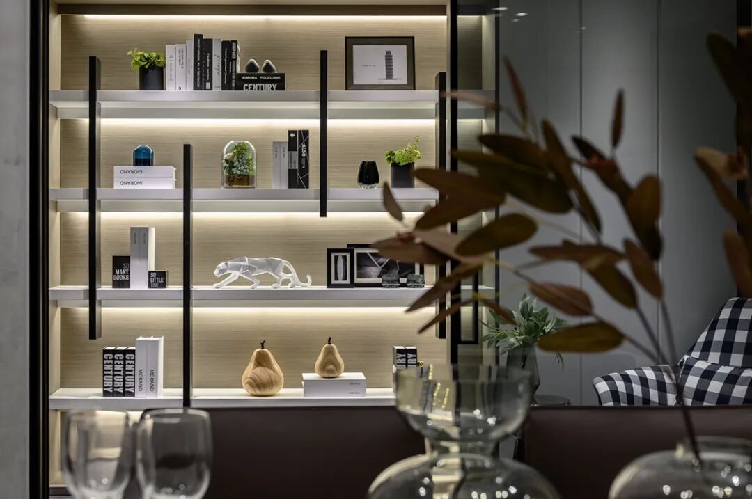 ▲书房定制上一面带藏光的书架,摆上一张黑白格纹的休闲沙发椅,让书房氛围充满舒适轻松的气质。