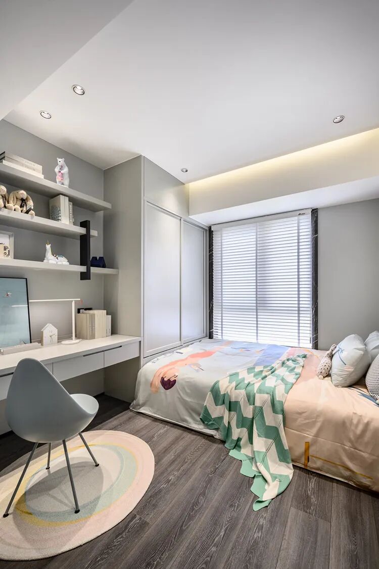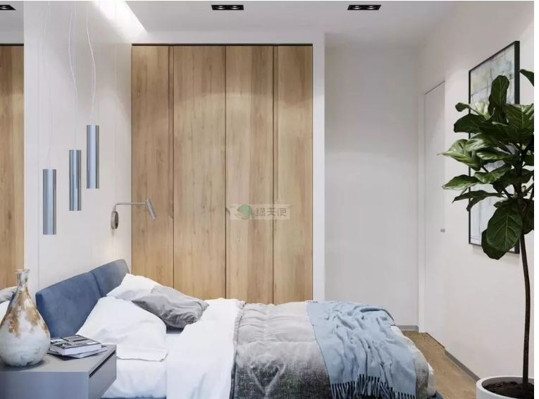 ▲次卧,衣柜选择木纹色,搭配布艺软床,呈现出一种稳重舒适的睡眠氛围气息。