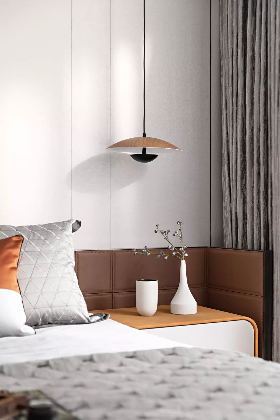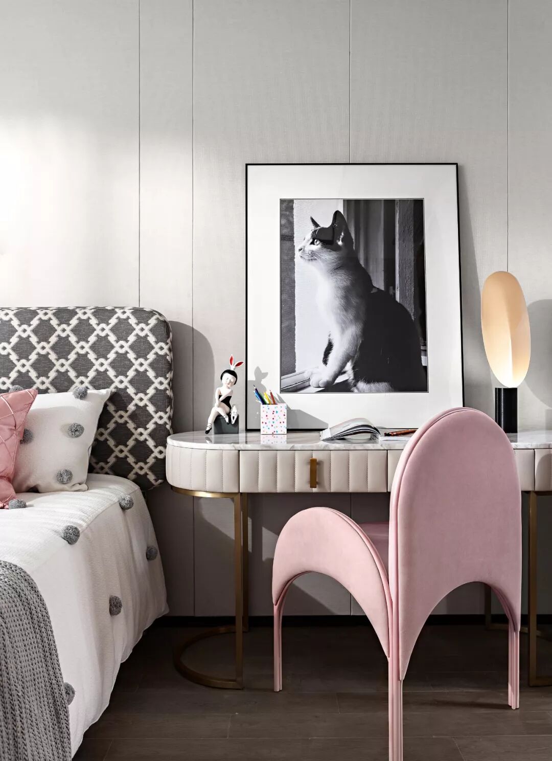 与此同时,我们舍弃了大尺度吊灯的设计,以小型床头吊灯和台灯的组合,营造一个适度的光感氛围,继而构建一个不受外界打扰的有趣的休憩空间。