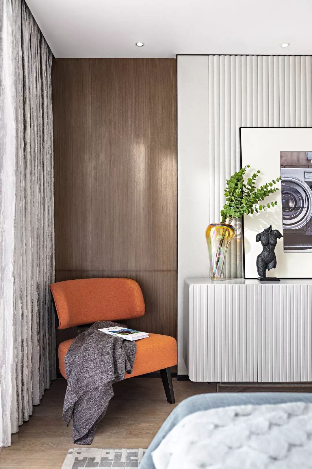 主人房则在此基础上增加了亮丽的橙色和典雅的蓝灰,独特的花器、残缺的人像摆件、影片中穿行于村庄之中的摄影车饰画定格于空间,生活的艺术与空间的雅致同源而生。