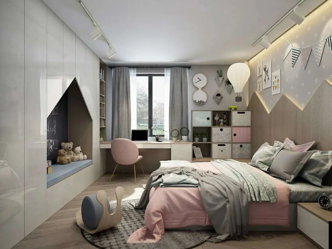 不同颜色和空间布局,在陪伴孩子成长的过程中,会潜移默化地影响着孩子的审美观和性格。对于儿童房的布局,除了选好配色,还得预留足够的活动空间。