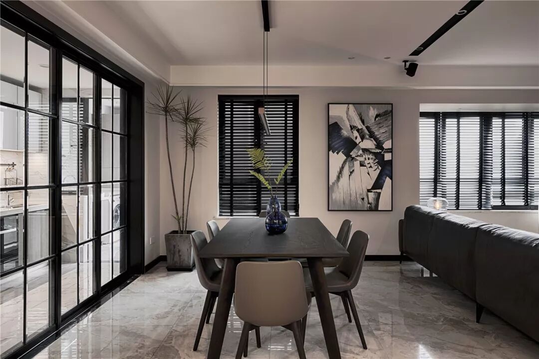 黑色框架玻璃门将厨房与餐厅分开,黑白相间的设计简单直接具有一股与生俱来的朴素气质。恰到好处的运用于现代空间,也在质朴之中营造了一种奢华感受。时尚与舒适、从容与精细,这些看似矛盾的个性在碰撞时却产生了美妙的感官旋律。