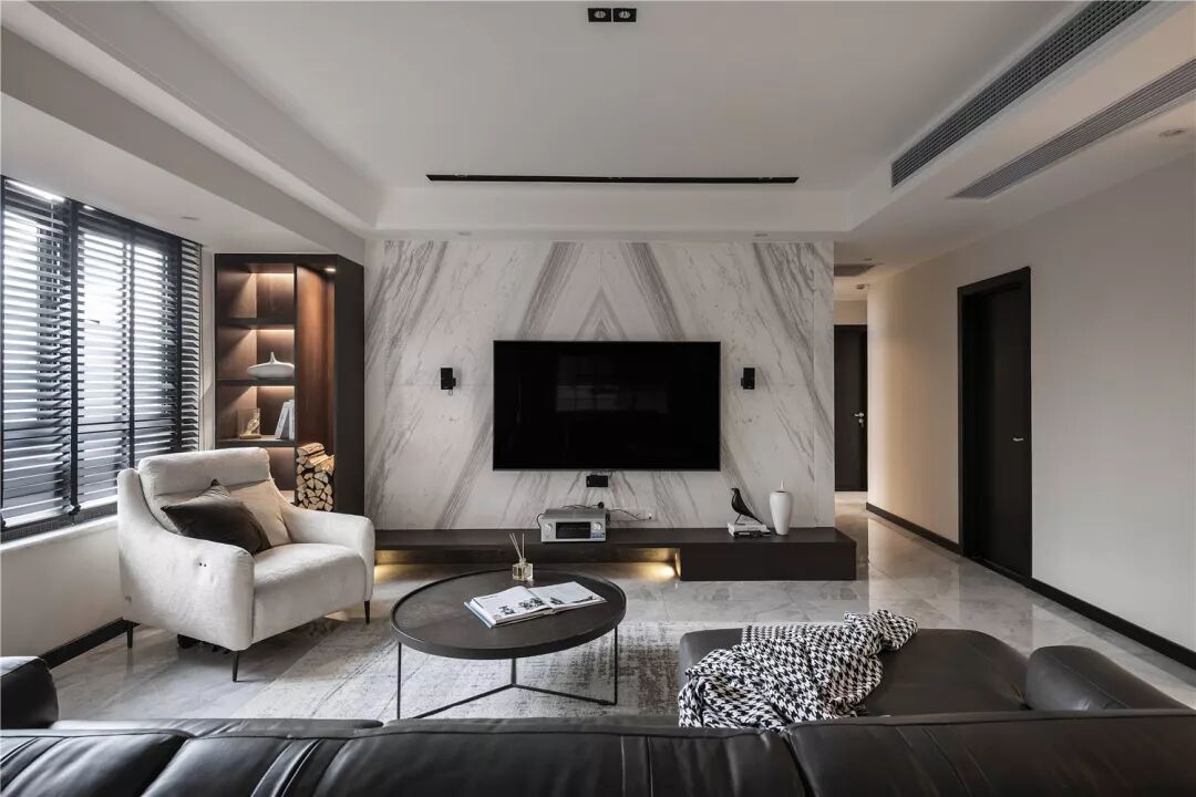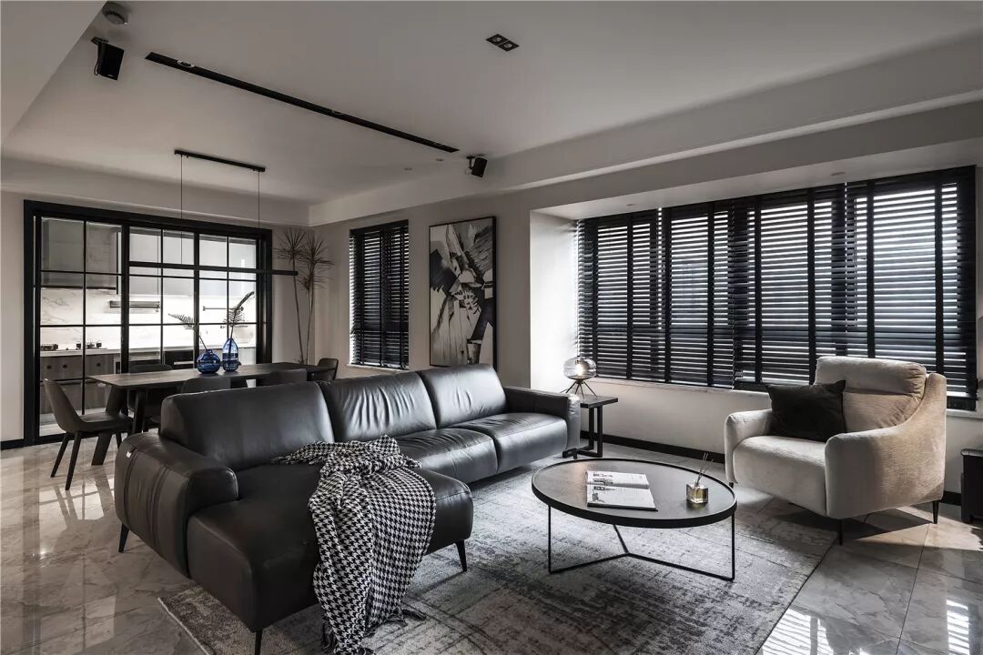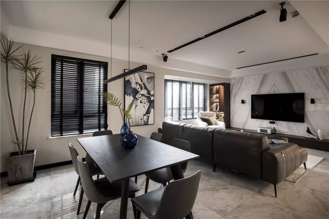 七米五横厅的设计使空间比较开阔与入户门厅和书房无缝连接,一门到顶的柜体设计将黑白灰的配色完美呈现,客厅的整体是明亮通透的大空间,使人感到舒适、惬意。