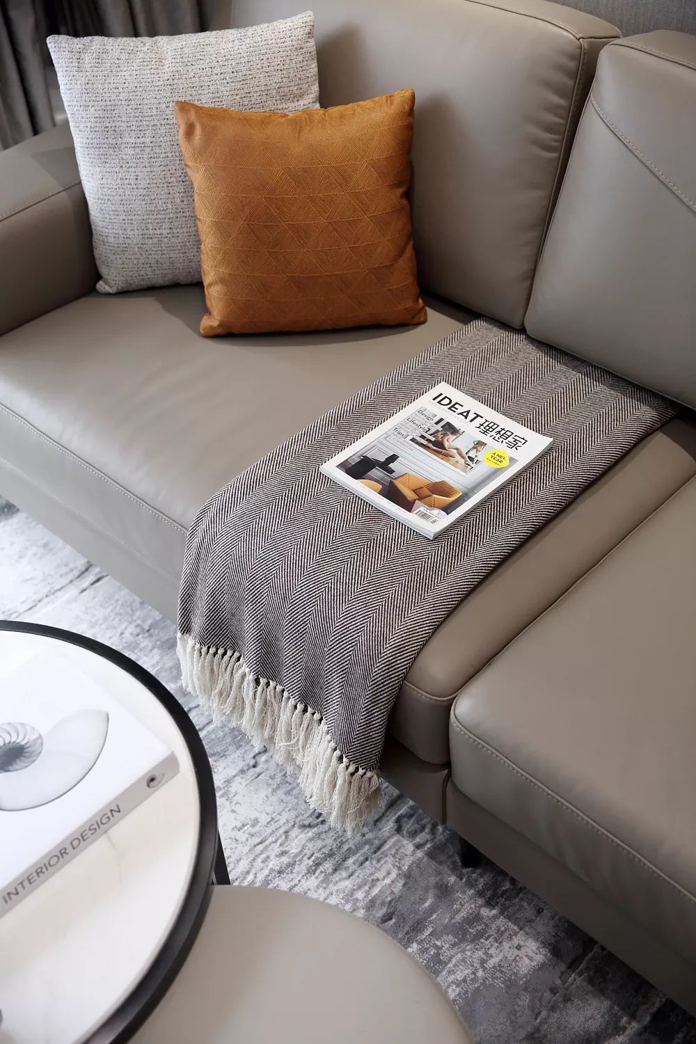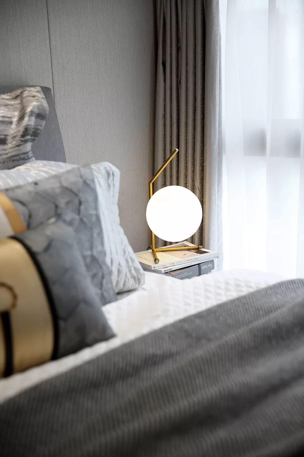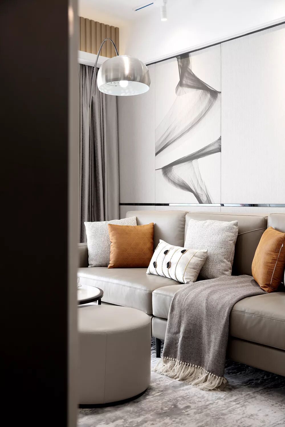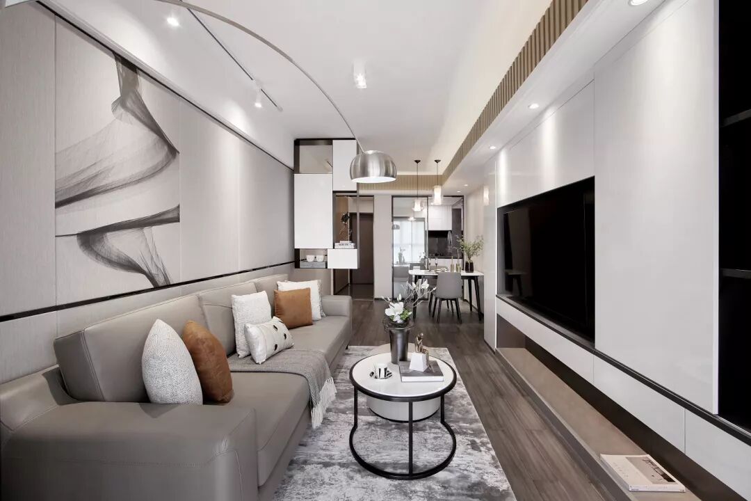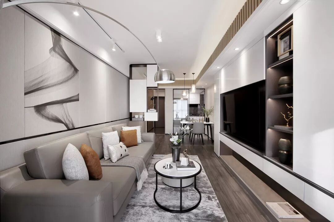 空间游离在黑白灰之间,并采用棕黄色作为跳跃色,舒适的沙发、灰色条纹地毯、时尚的抱枕和经典的钓鱼灯,营造出丰富多元的空间情感。色泽交替与造型转换,都在不经意间彰显着主人的个性与品位。
