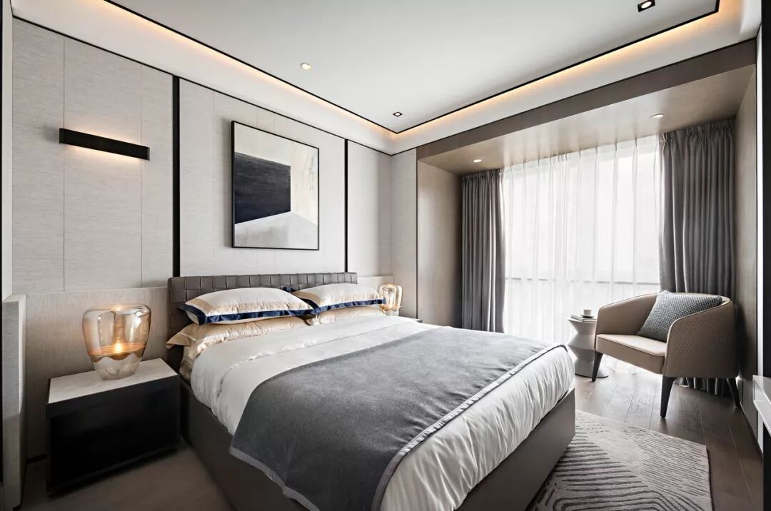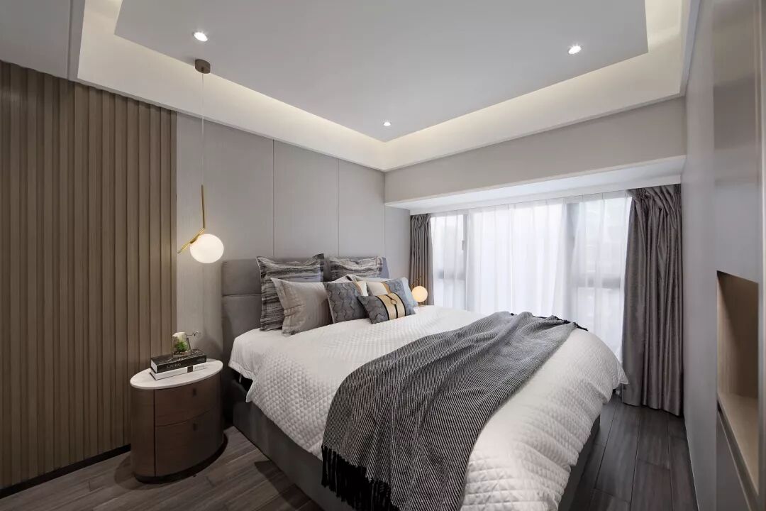 主卧室拥有充裕的采光,阳光透过窗纱潜入卧室,照在棉麻的床品上,在空间中好似有一种光与影的纯粹对话。木格栅与硬包在纵横间强化虚实韵律。垂落的吊灯,慵懒的床品、在简洁舒适中营造出安静惬意的环境。