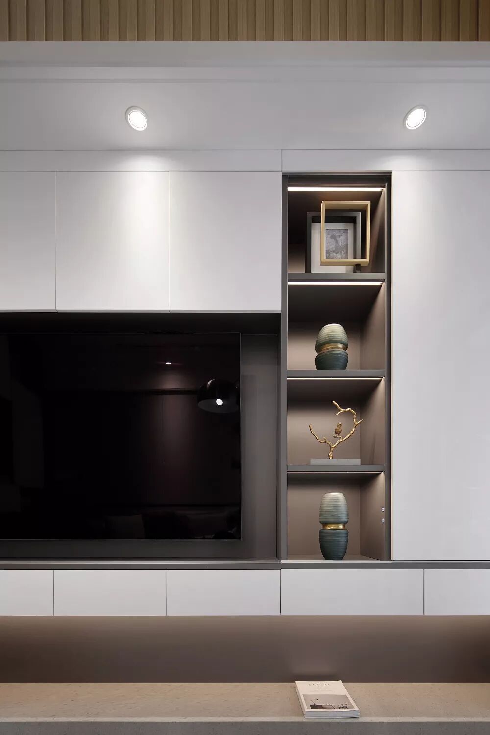 每一条线都经过精心设计,横线的平稳,竖线的冷静,纵横织就了现代空间的节奏感。与之对比的是背景墙上的大幅铁桥摄影的线条发散出的张力。