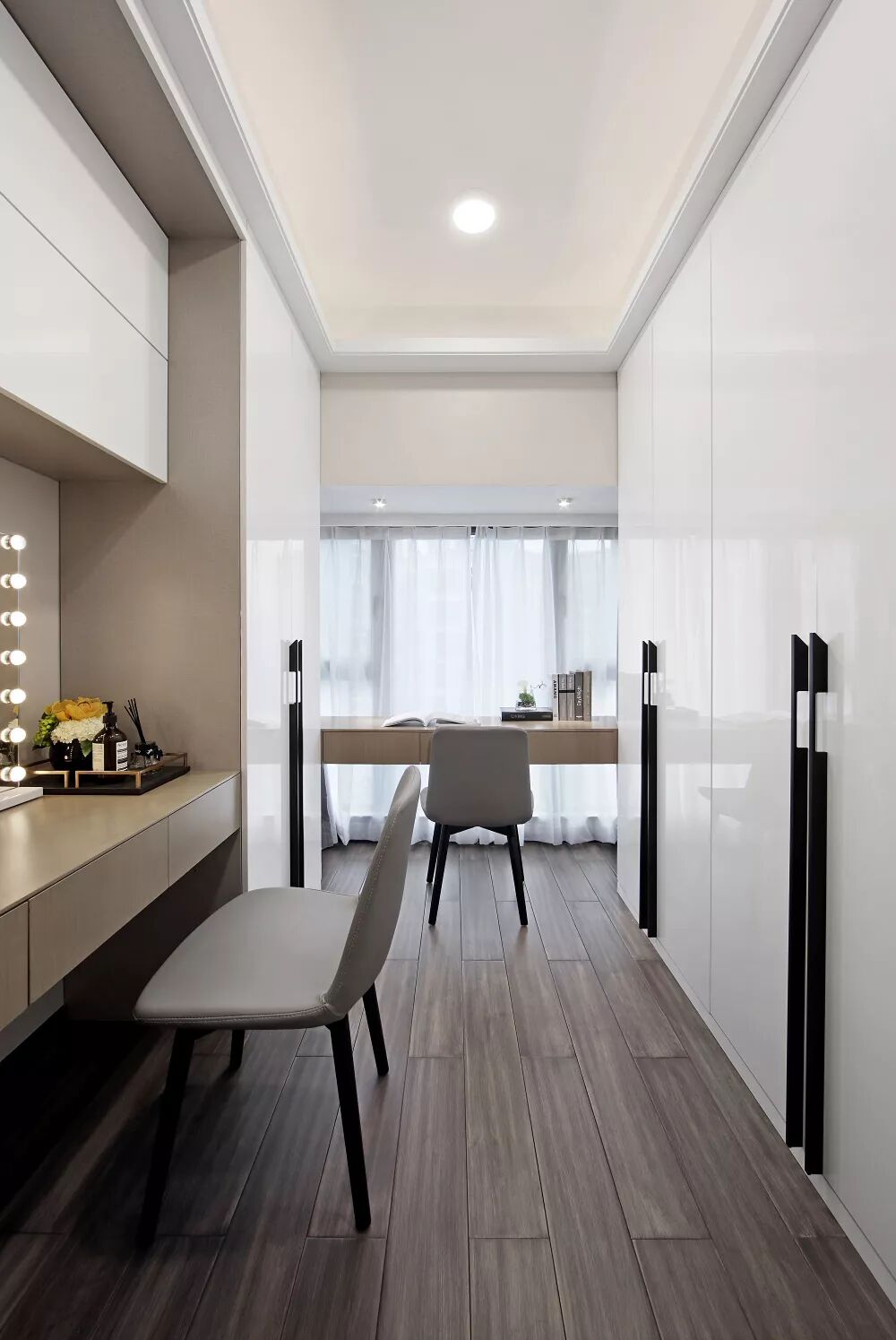 步入式衣帽间与书房巧妙结合,采用白色基调打底,与浅木色的结合使空间变得温和,开放的布局吸纳阳光空气,让休憩安然惬意、舒适、宁静。