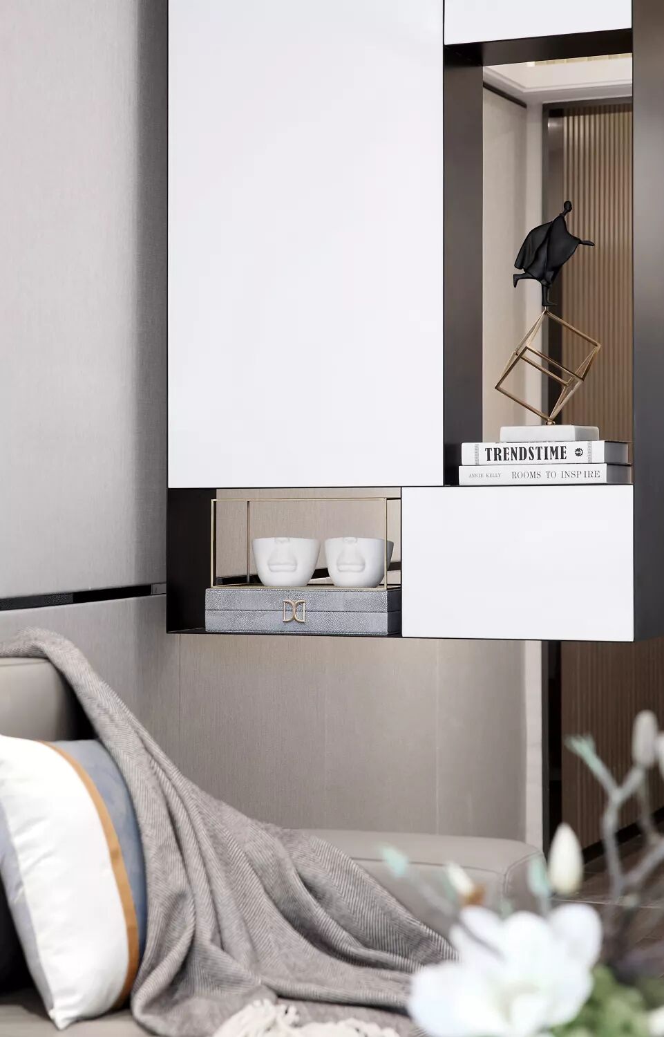 高级灰占据的卧室,弱化无足轻重的饰品,卧榻的地位被凸显无疑。墙面大幅绘画,选用弗洛伊德式的“梦”主题,如同一扇门打开远方。